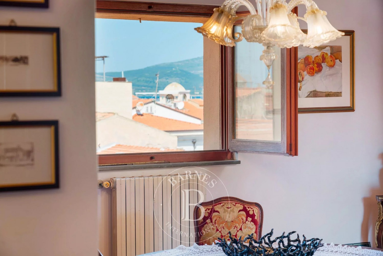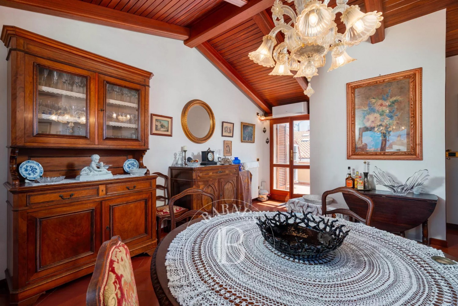 The apartment boasts bright and spacious rooms that offer charming views of the roofs and churches of the historical center. The penthouse is equipped with an autonomous heating system, composed of heat pumps and radiators. The precious details include floors in fine Florentine terracotta and ceilings with exposed wooden beams. The property is sold partially furnished, including the library in the study and the kitchen.