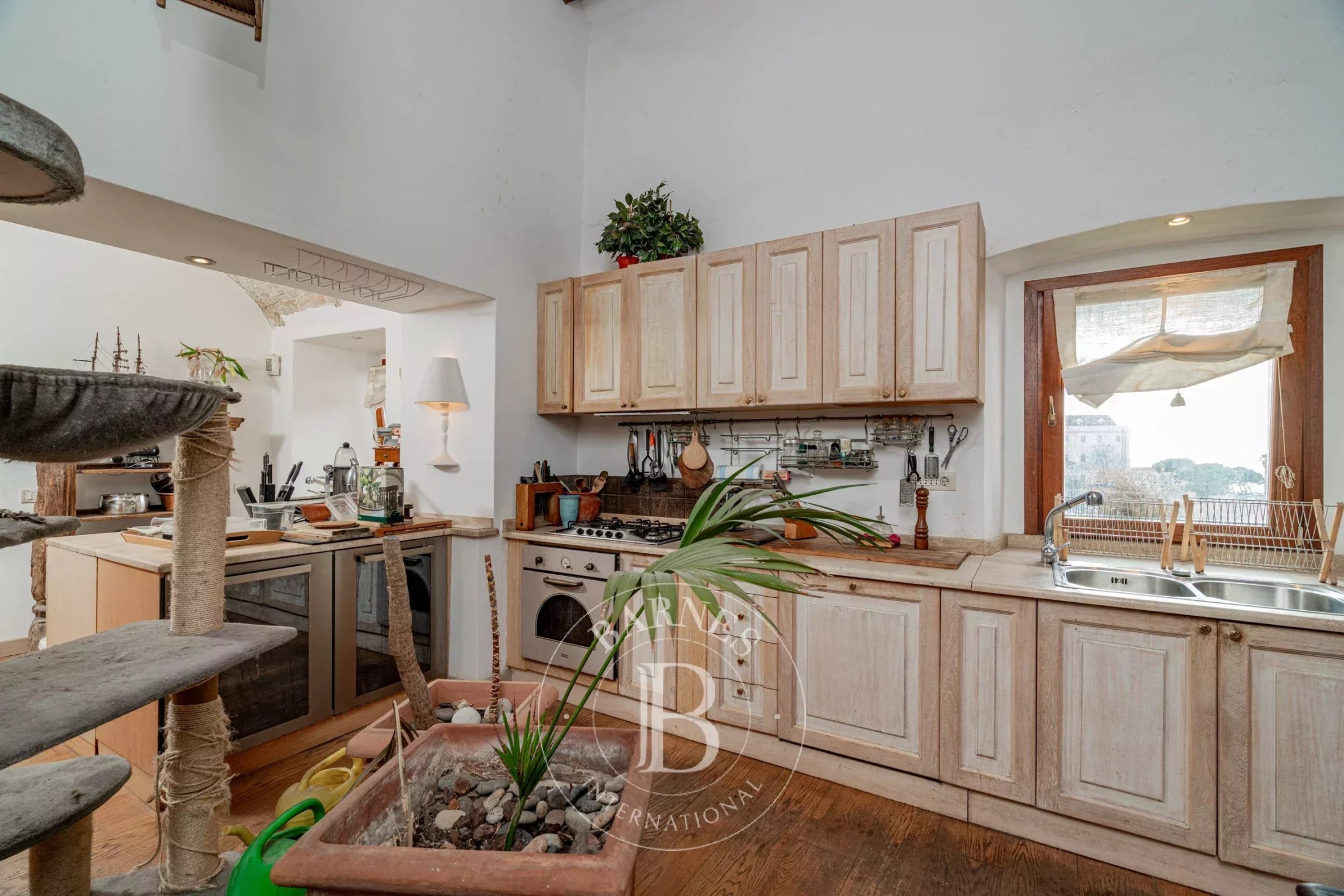 while the second entrance leads directly into a well-equipped kitchen with a central island, an eight-seat dining table, a gas stove, and both fan-coil and radiator heating.