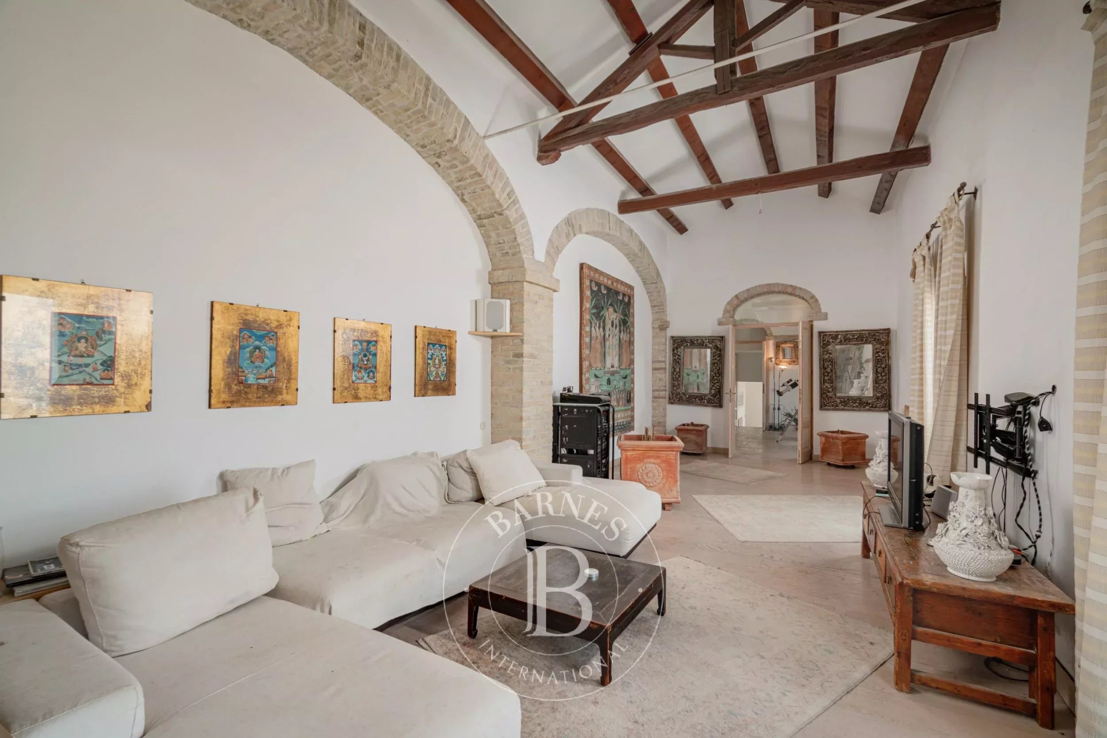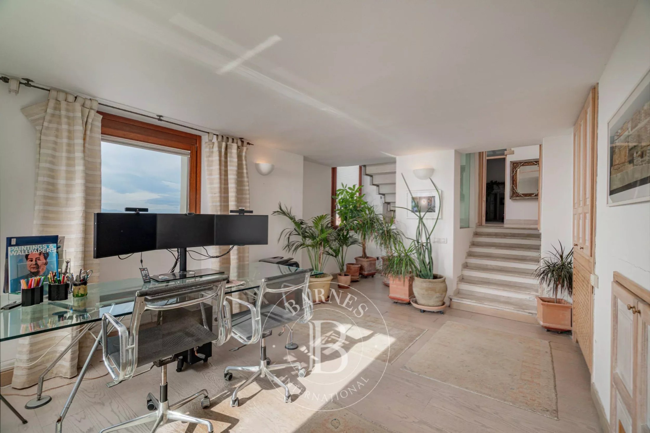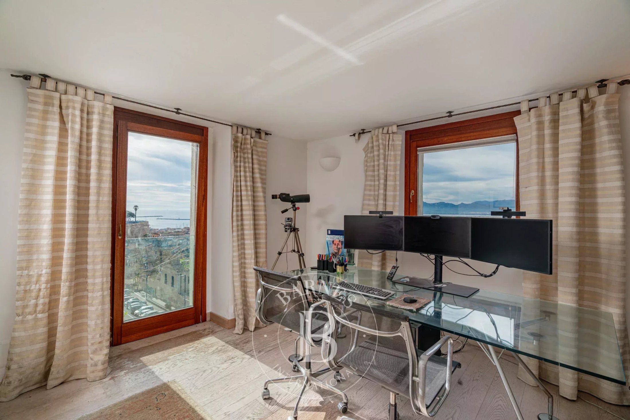 The living area is defined by its exceptional brightness and wide panoramic windows overlooking the city and the sea, creating a warm and refined atmosphere.