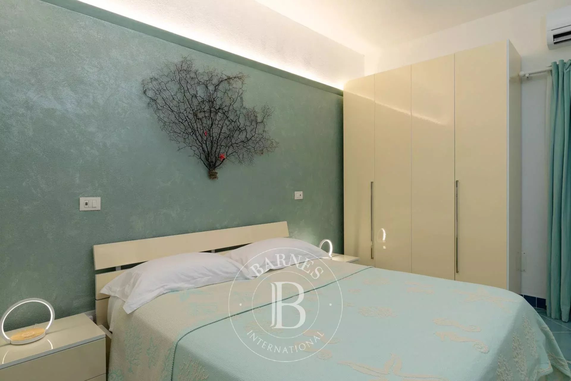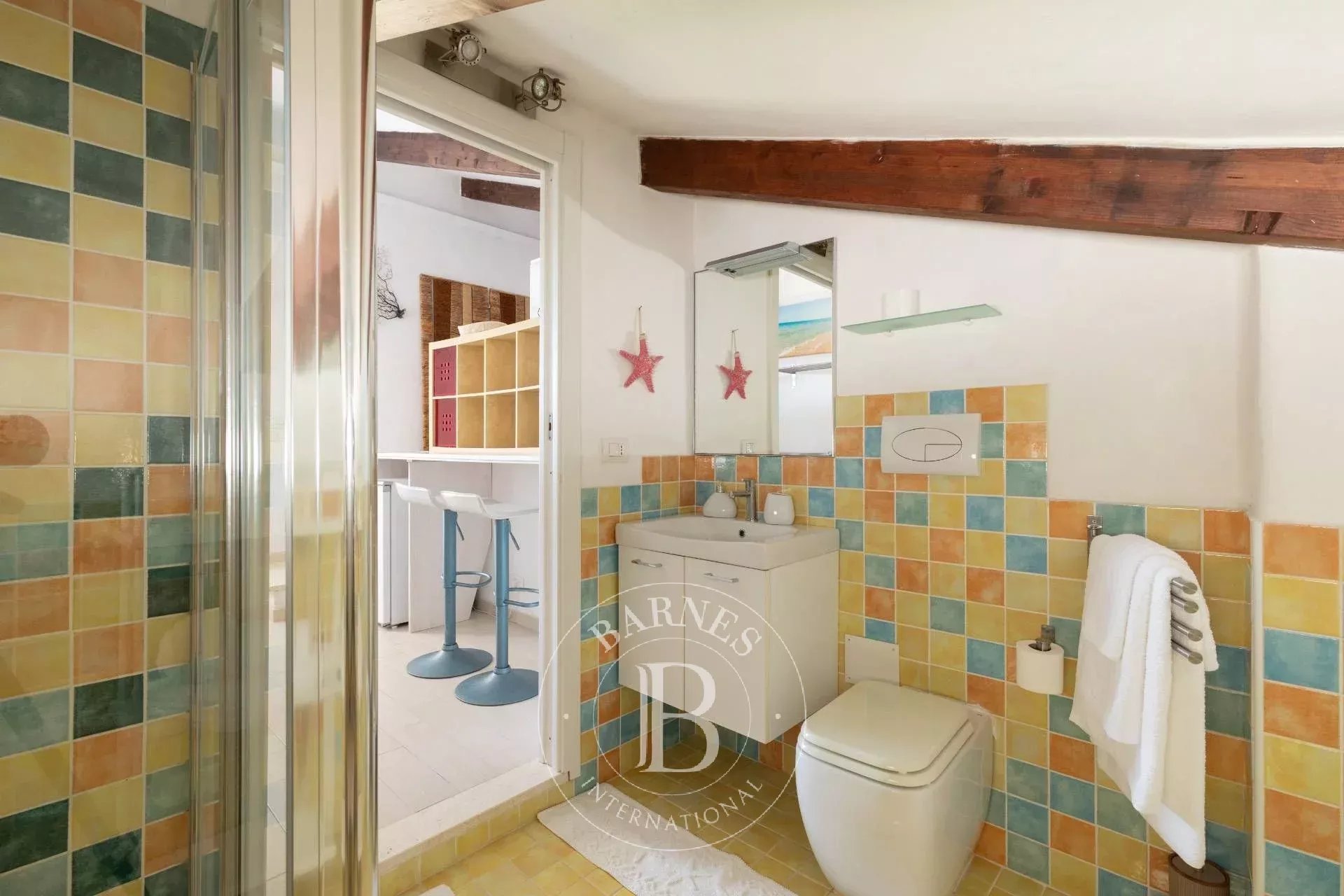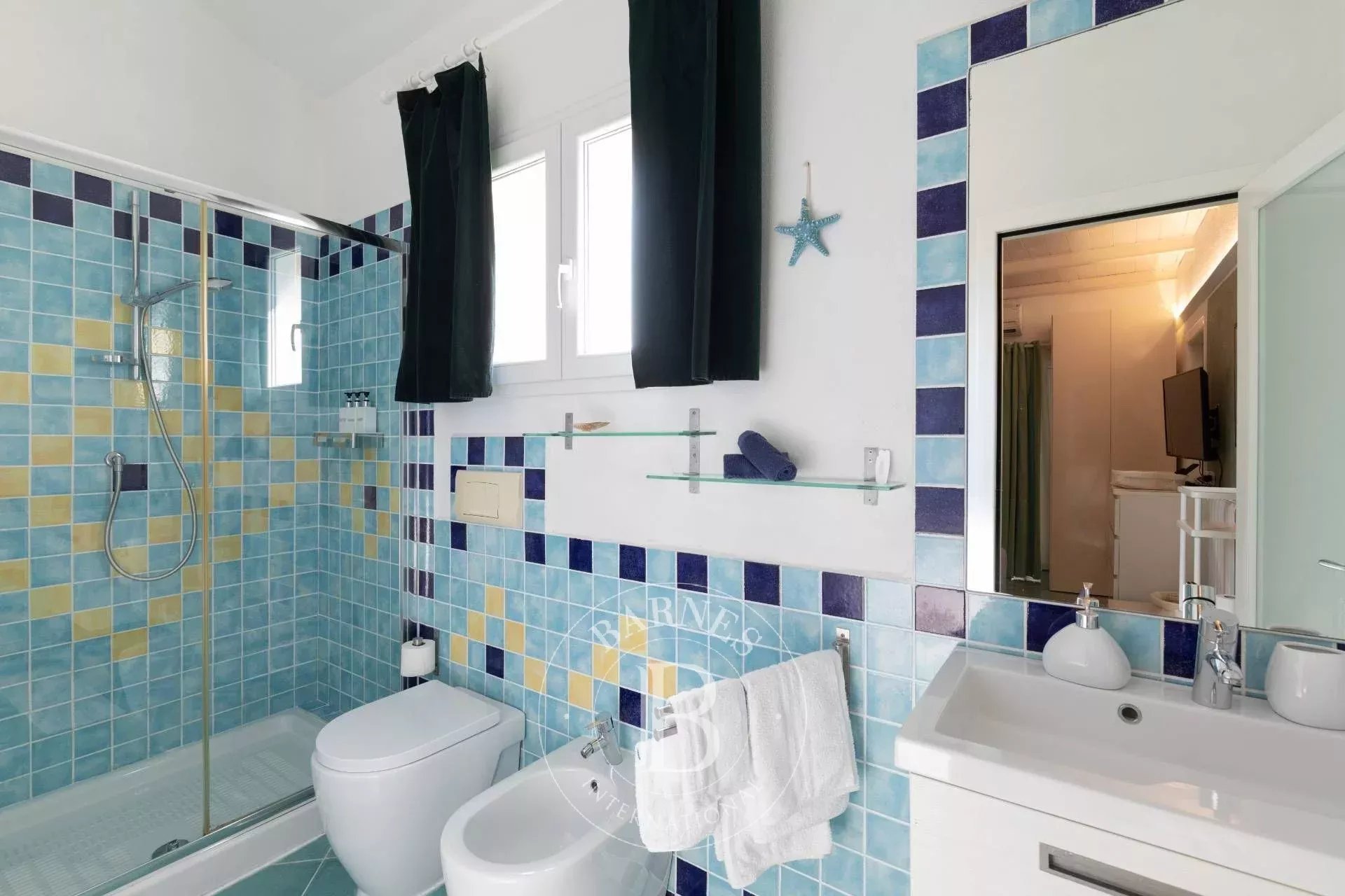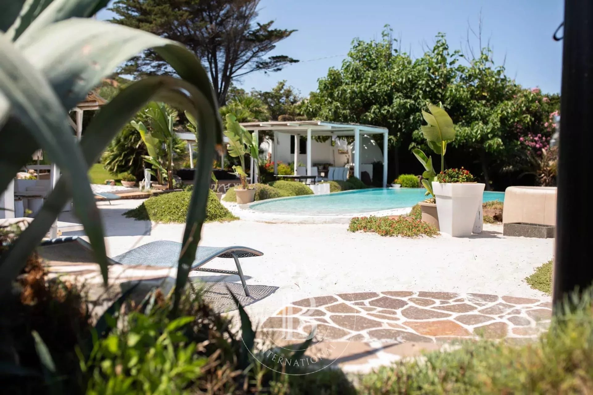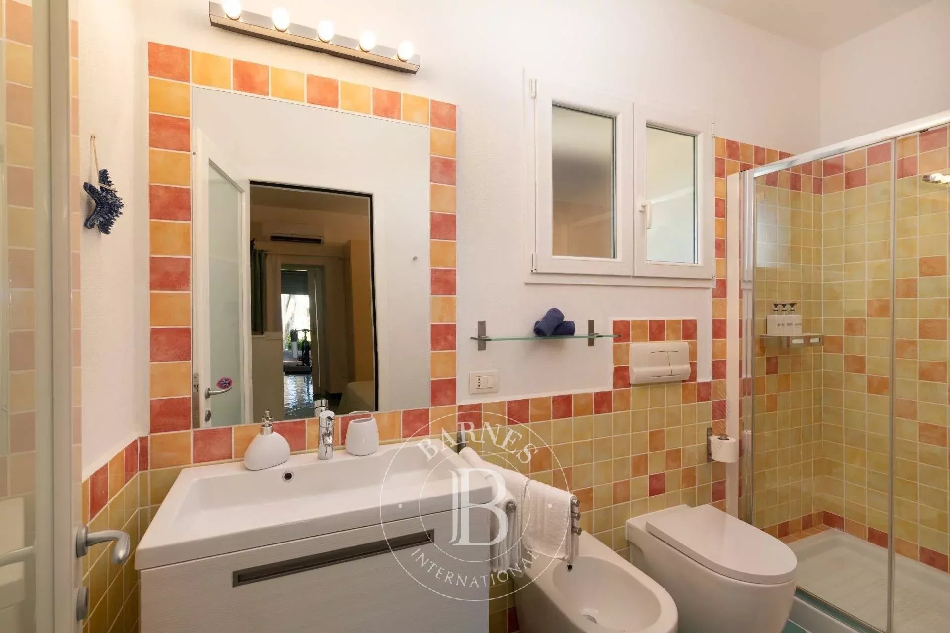 Inside, the same contemporary elegance continues with bright living spaces overlooking the sea, a main kitchen, five en-suite bedrooms, and a guest suite with kitchenette and private bathroom—ideal for visitors or staff. Handcrafted details, such as Sardinian wax ceramics in Mediterranean blue tones, highlight the island’s tradition with a modern flair.
