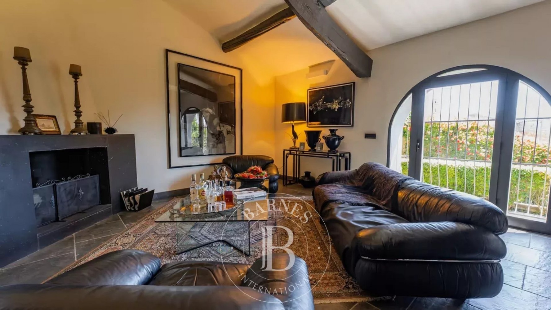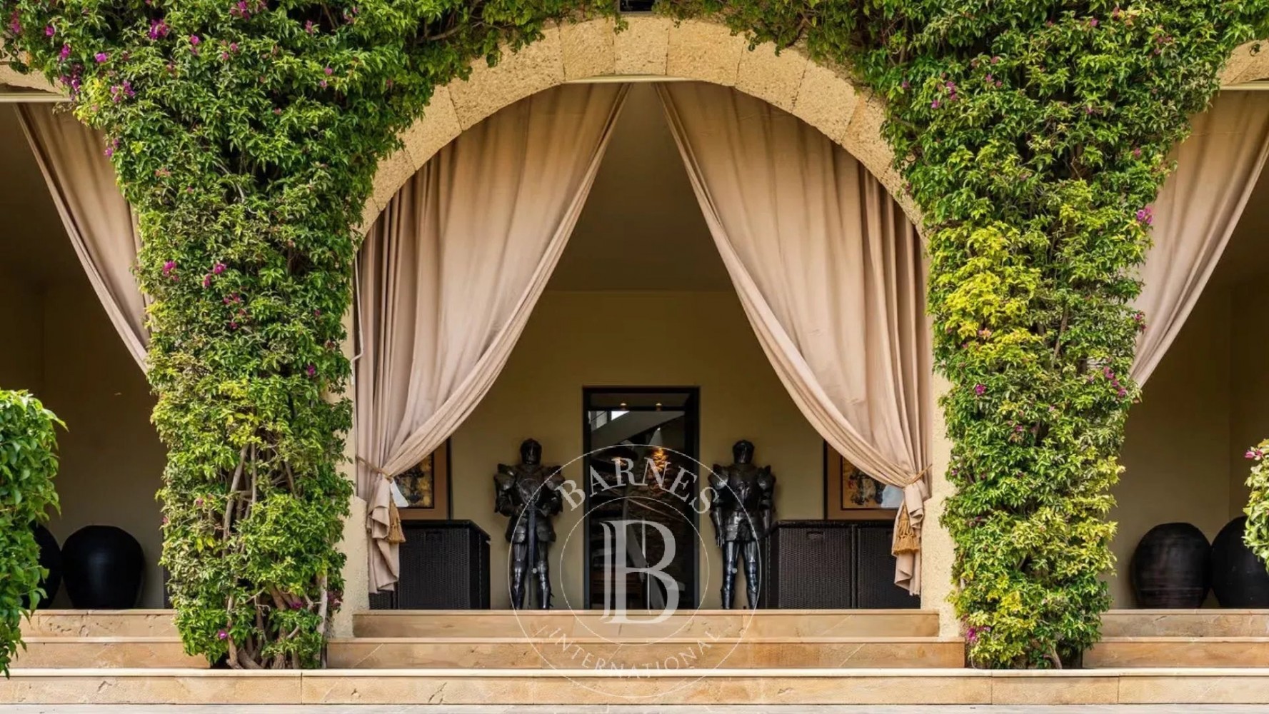 The refined interiors feature generous living spaces, a dining room with fireplace, and six elegant bedrooms, many of which open onto panoramic terraces.