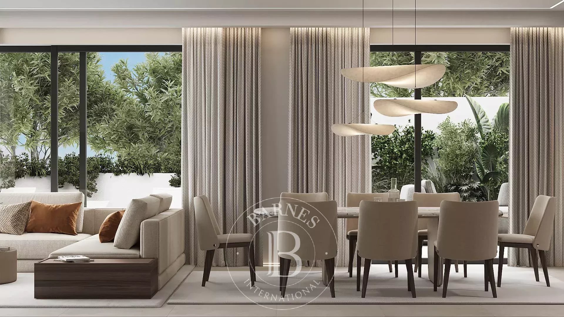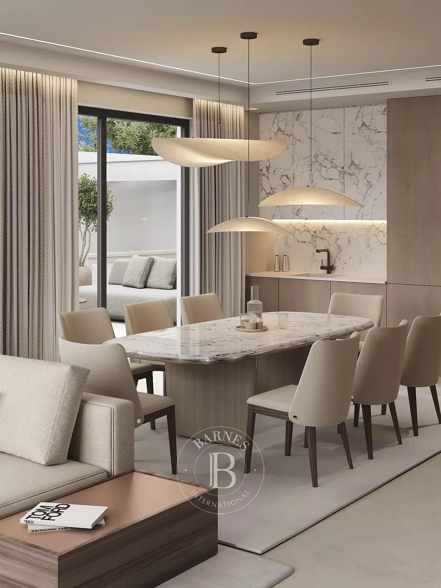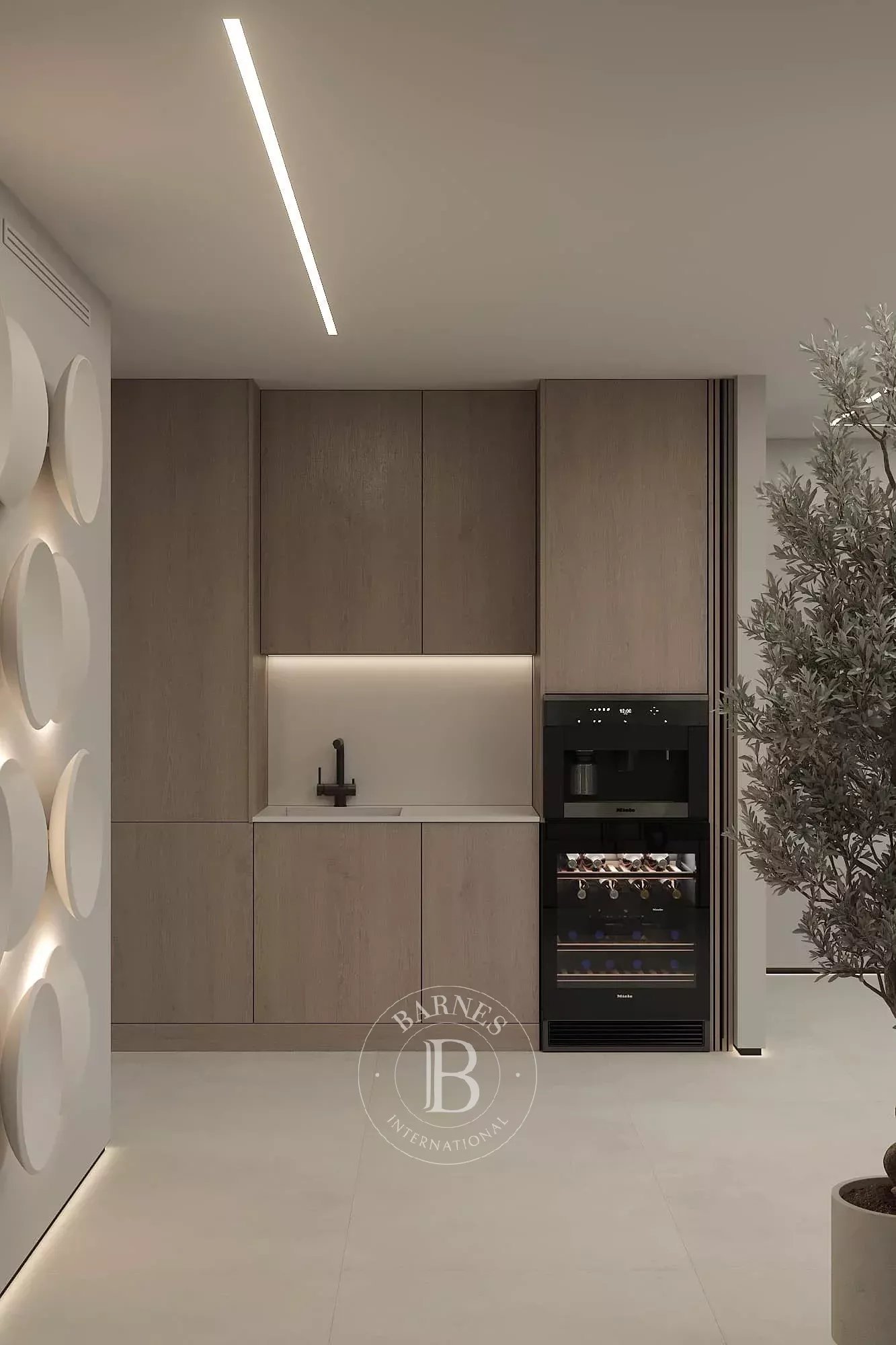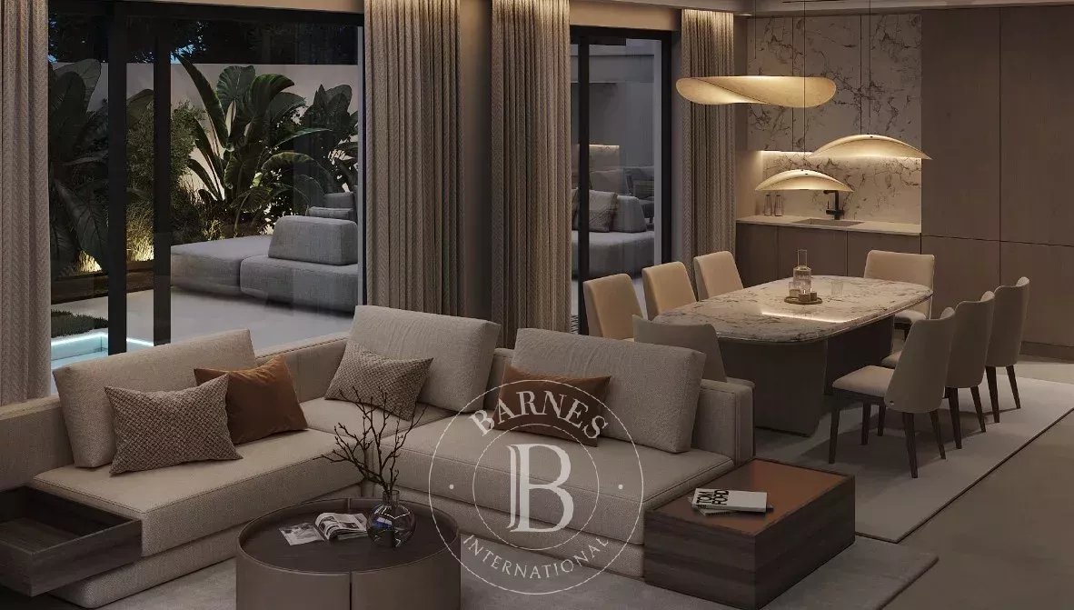 The open-plan living area with its fully equipped designer kitchen opens directly onto the terrace and pool, blending indoor comfort with outdoor relaxation. Natural materials, warm tones, and artisanal details create an atmosphere of harmony and understated sophistication.