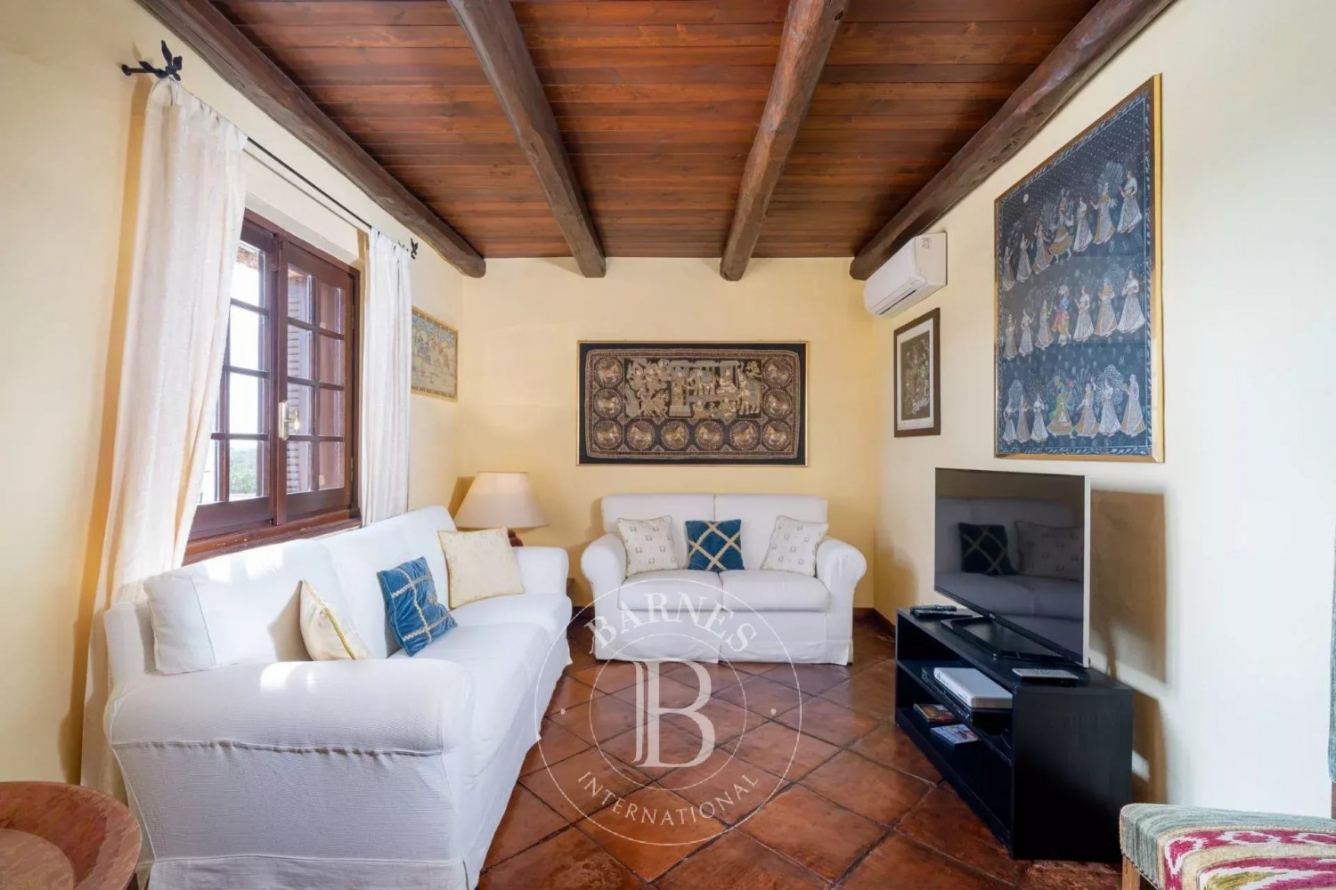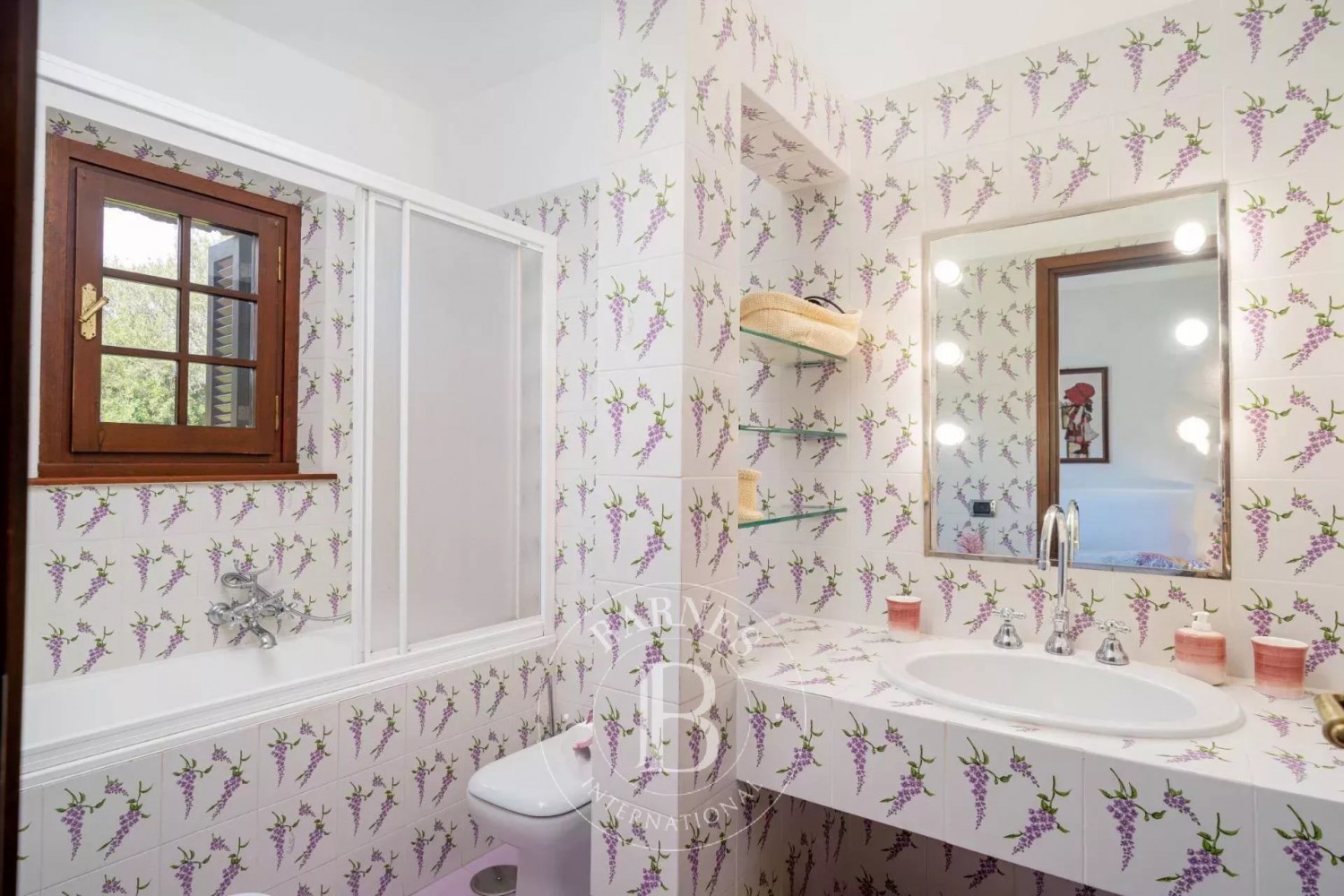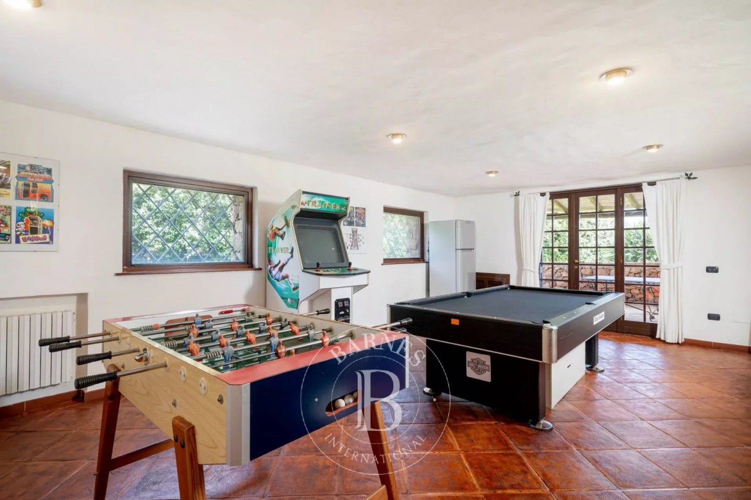 Built with a particular respect for the surrounding environment, the villa is spread over two floors and boasts elegant furnishings, enriched by some original antique pieces. On the ground floor, there is an entrance, a spacious living room opening onto a terrace of approximately 100 square meters, a dining room, a fully equipped kitchen, four bedrooms, each with a private bathroom, a TV room, and a study with a computer, laser printer, telephone, and fax machine. The lower floor houses two additional bedrooms, both with en-suite bathrooms, a second kitchen used as a laundry room, and a games room with a ping pong table, pinball machine, and foosball table. A spacious veranda covers the entire front of the villa, furnished with sofas, chairs, and a table that can accommodate 12 people.