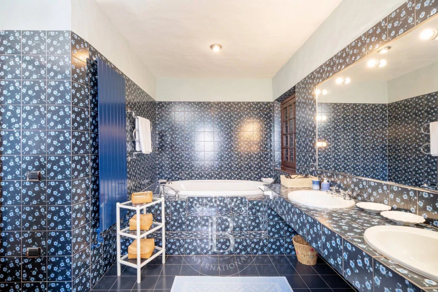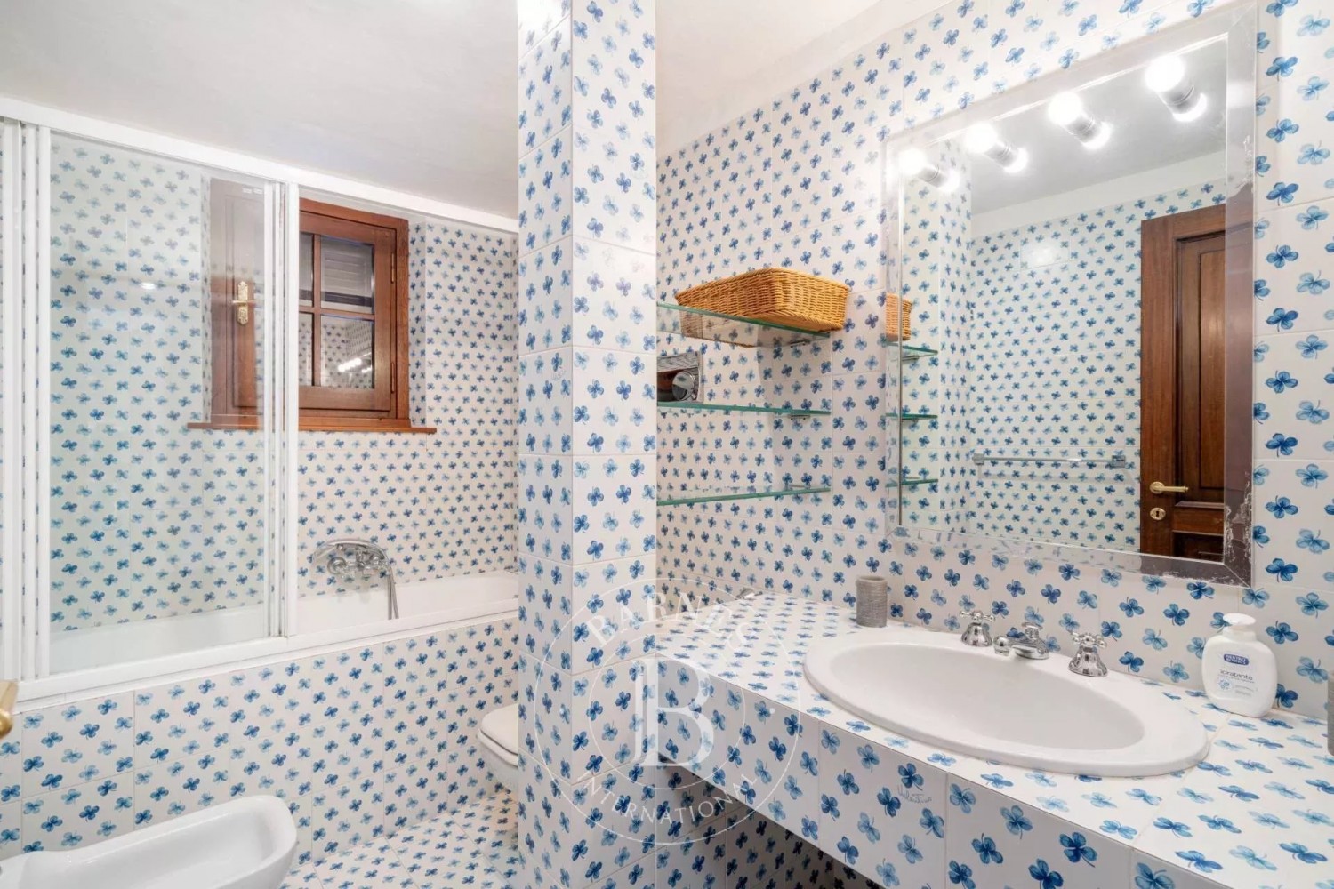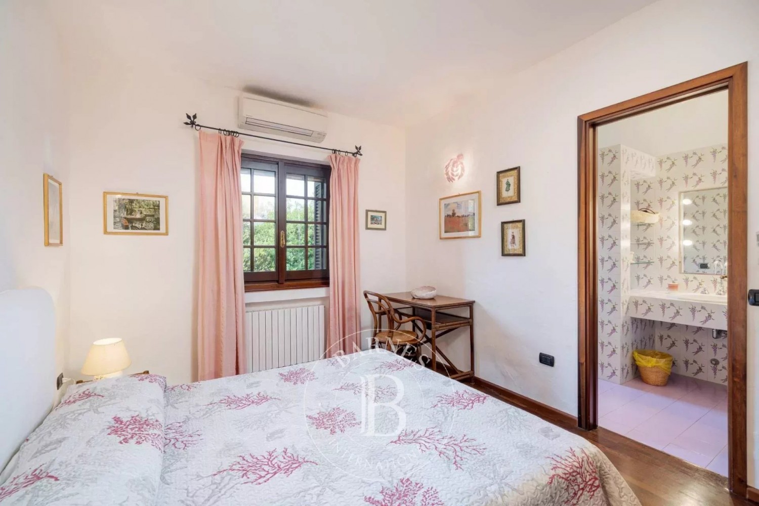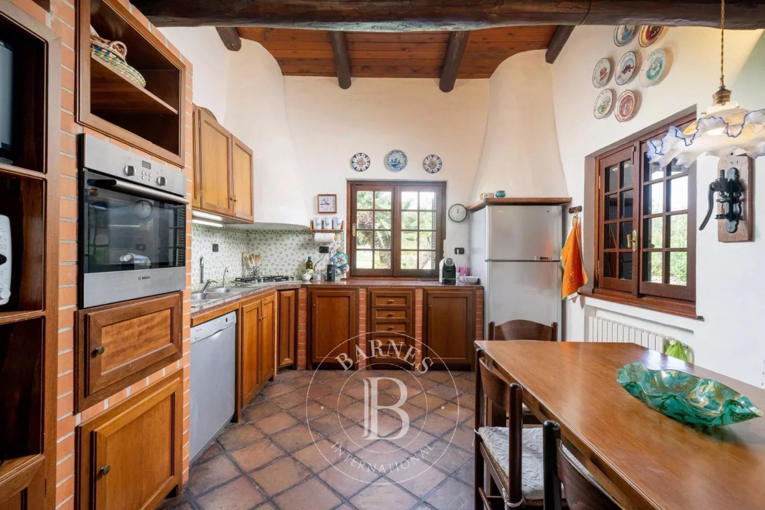 Built with a particular respect for the surrounding environment, the villa is spread over two floors and boasts elegant furnishings, enriched by some original antique pieces. On the ground floor, there is an entrance, a spacious living room opening onto a terrace of approximately 100 square meters, a dining room, a fully equipped kitchen, four bedrooms, each with a private bathroom, a TV room, and a study with a computer, laser printer, telephone, and fax machine. The lower floor houses two additional bedrooms, both with en-suite bathrooms, a second kitchen used as a laundry room, and a games room with a ping pong table, pinball machine, and foosball table. A spacious veranda covers the entire front of the villa, furnished with sofas, chairs, and a table that can accommodate 12 people.