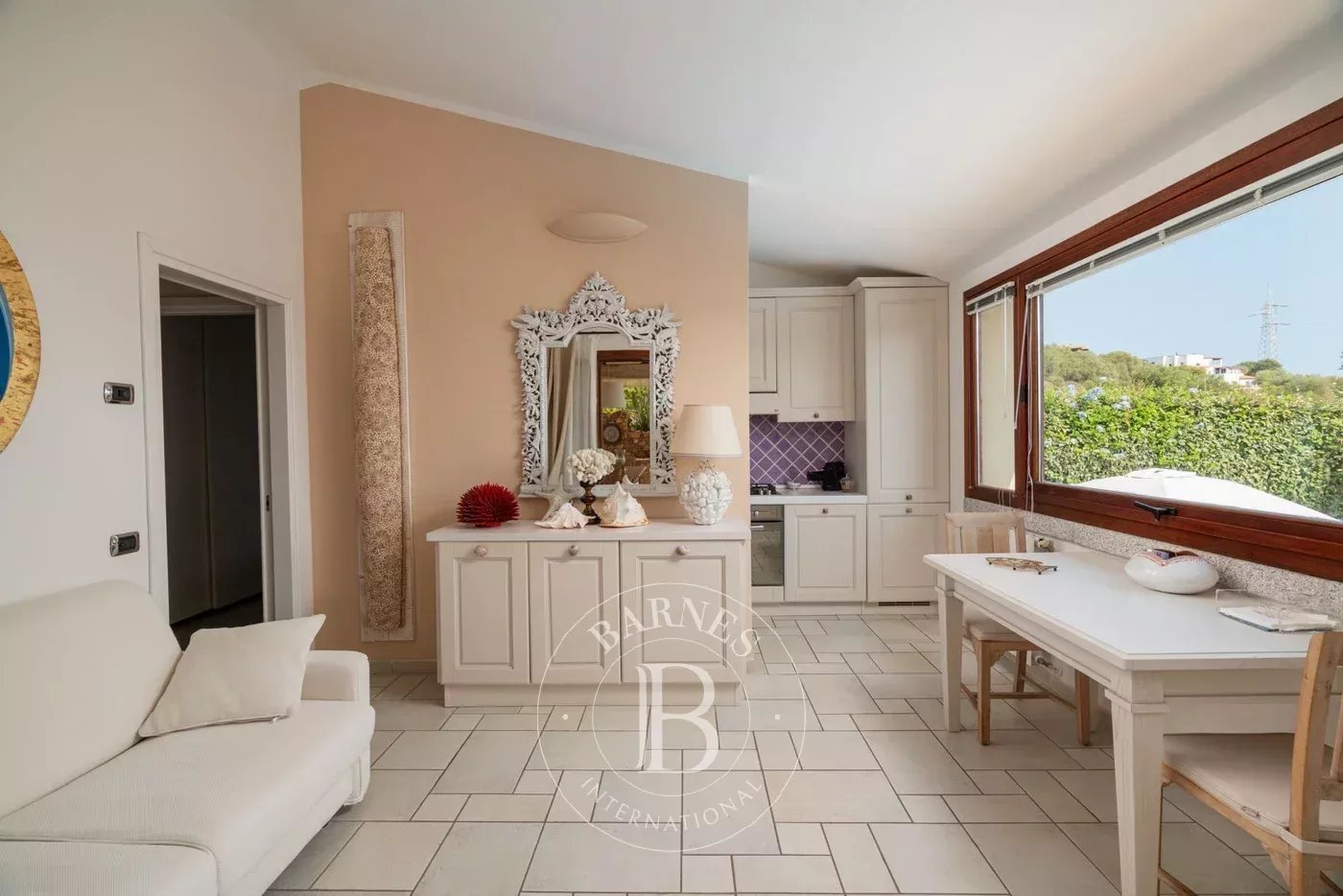 The ground floor houses one of the double bedrooms, equipped with a private bathroom, and the service room. An internal staircase leads to the upper floor, where guests are greeted by a sunlit living area. This space is ideal for unwinding after a day spent exploring Sardinia's wonders. Adjacent to the living area is a fully-equipped kitchen, ready to whip up delicious dishes using local ingredients.