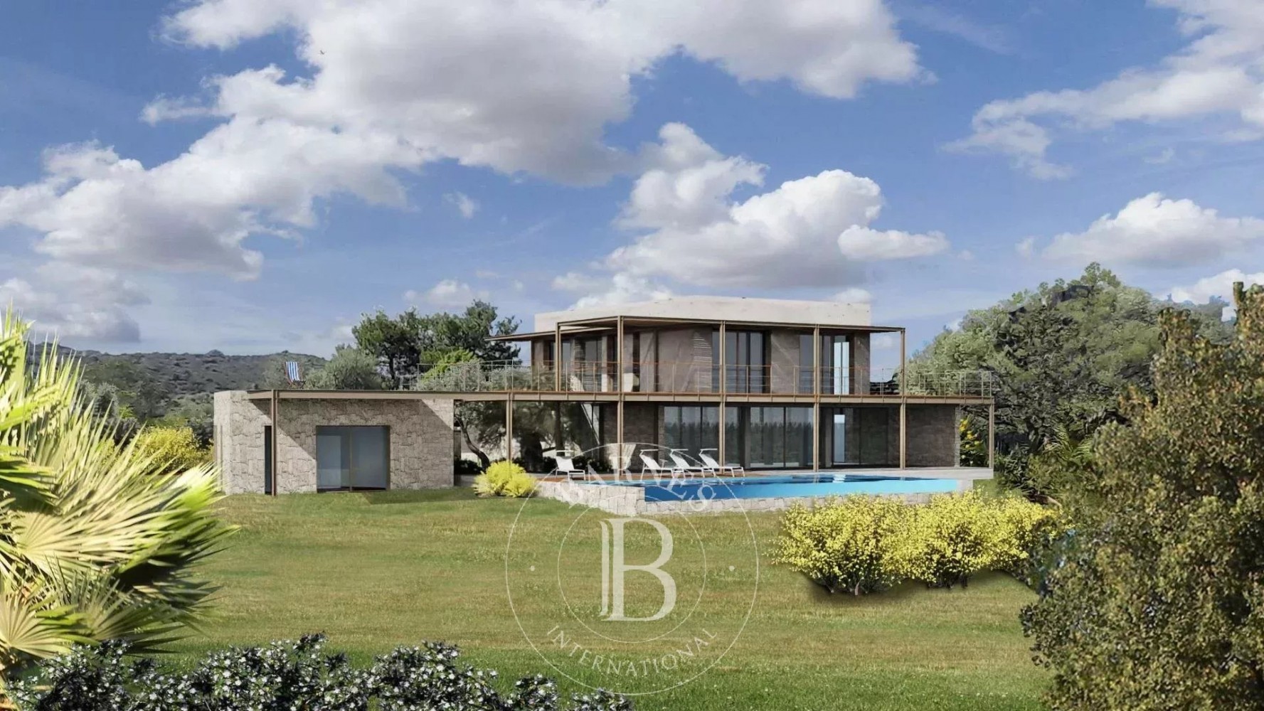 The property features exclusive entrances, covered parking for four cars with an electric charging station, a main villa with spacious verandas and terraces, a connected annex, and an infinity pool that blends seamlessly with the sea. The villa boasts a living area of approximately 267 sqm and is set on a 4100 sqm plot, surrounded by lush Mediterranean landscape to ensure tranquility and privacy.