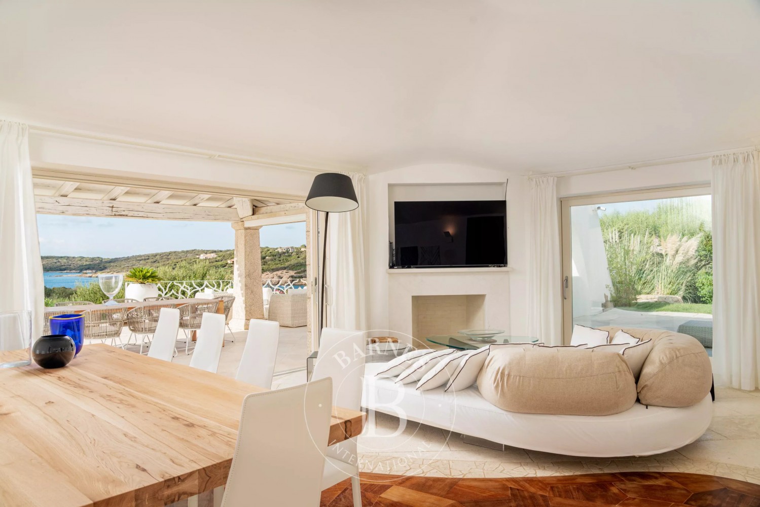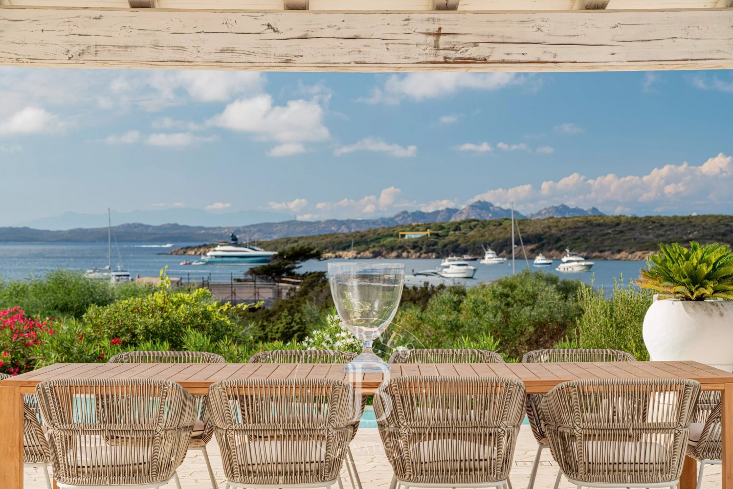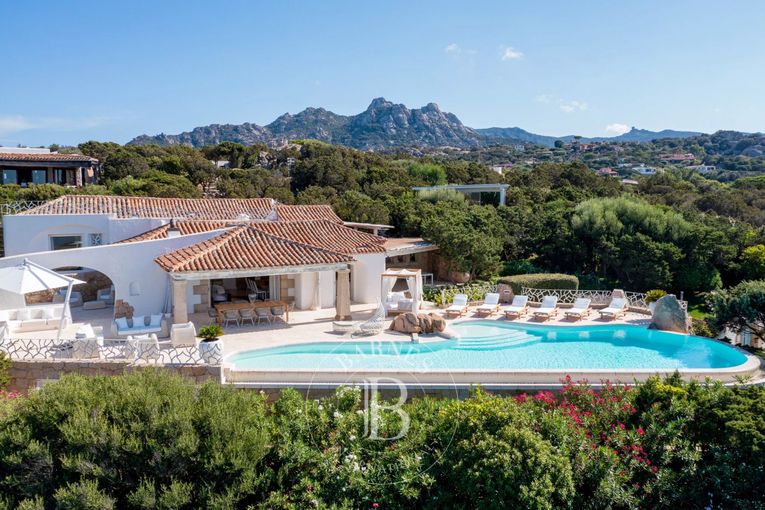 Inside, the villa is characterized by a fresh and refined style. Outside, the large garden surrounds the beautiful property, with a magnificent irregularly shaped pool offering breathtaking views of the coast. Additionally, the villa has a vegetable garden to have fresh vegetables on the table, a small outdoor gym, and a private dock.