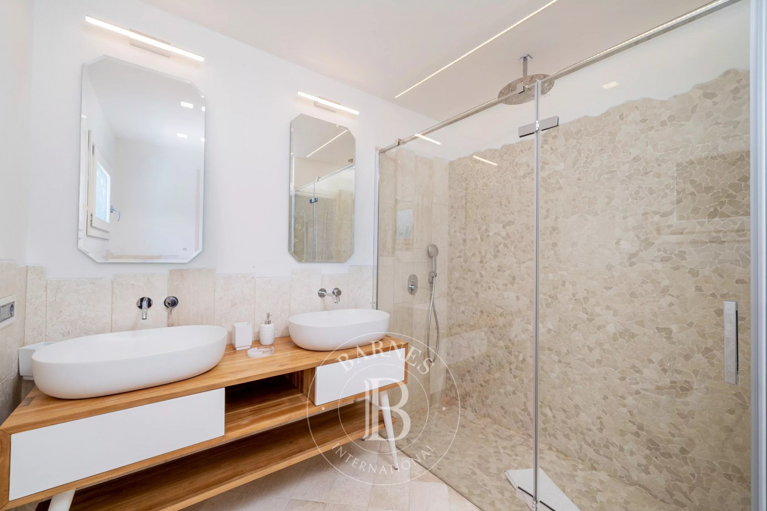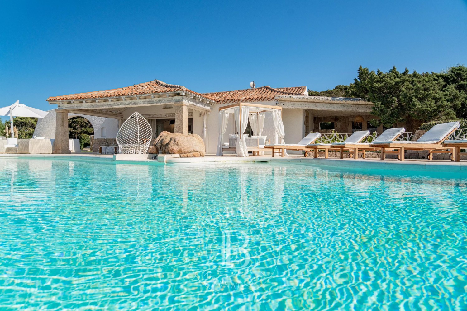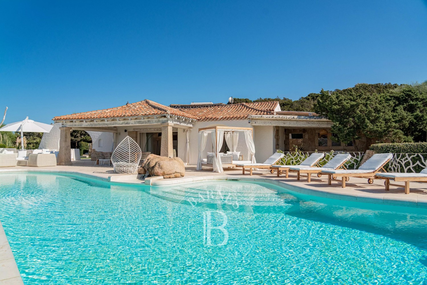 A large covered terrace, just above the pool, is perfectly furnished with sofas and outdoor chairs, creating an ideal place to spend pleasant summer moments in a shaded and cool area. The structure offers four bedrooms with private bathrooms, a bright and elegant living area overlooking the outside, and a fully equipped kitchen. A dependency a few meters away offers another bedroom with bathroom.