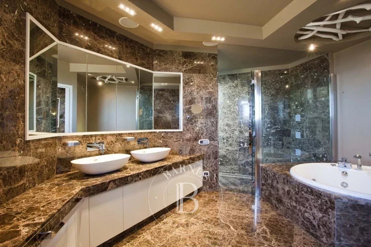 The lower floor features a cinema room with a stone fireplace and state-of-the-art audiovisual equipment with a large wall screen. A fully equipped gym with changing room and shower overlooks the underwater pool. On the same floor, there are 3 more suites with en-suite marble bathrooms and walk-in closets, each with separate access from the outside and, if necessary, communicating from the inside. The villa can accommodate up to 18 people, offering single and double beds, private and shared bathrooms.