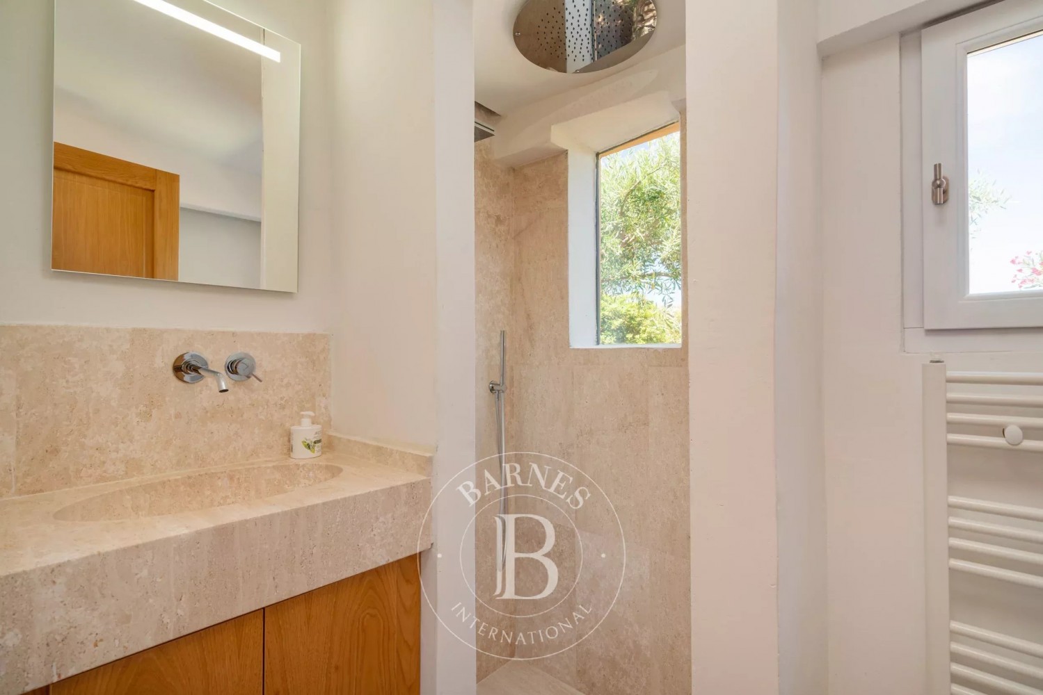 The villa comprises three charming bedrooms. Two of these are master suites, one of which boasts an en-suite bathroom, providing an exclusive and intimate corner of privacy. The third bedroom is a single room and shares a large, well-appointed bathroom fitted to the highest standards of luxury.