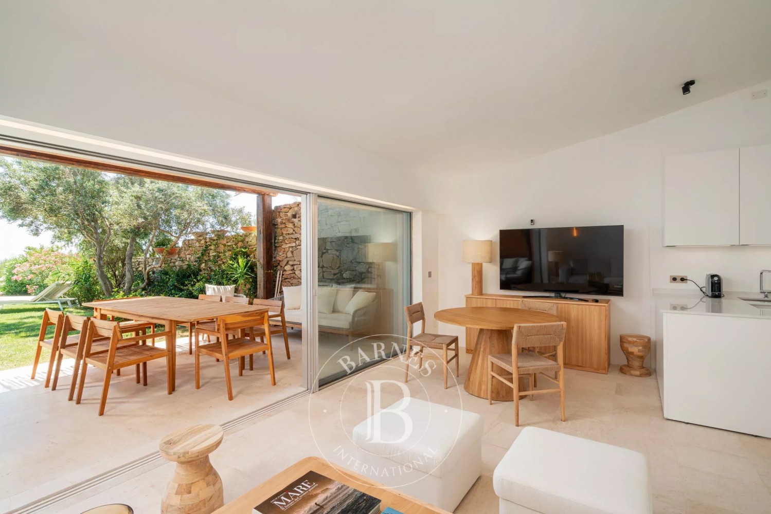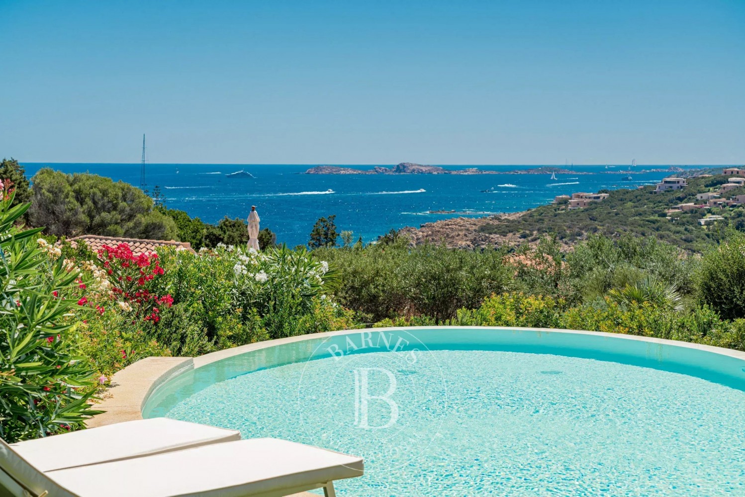 At the heart of the villa, a bright and spacious living room flows into a lush private garden, complete with a freshwater pool. This outdoor space is perfect for basking in the warm Sardinian sun or enjoying alfresco dining, all while taking in the breathtaking vista of the crystal blue sea stretching out into the horizon.