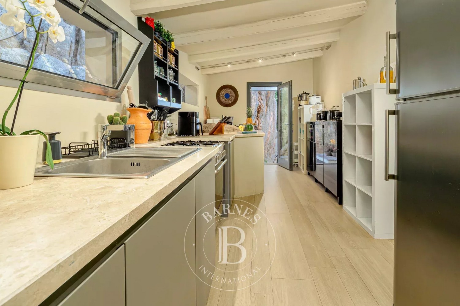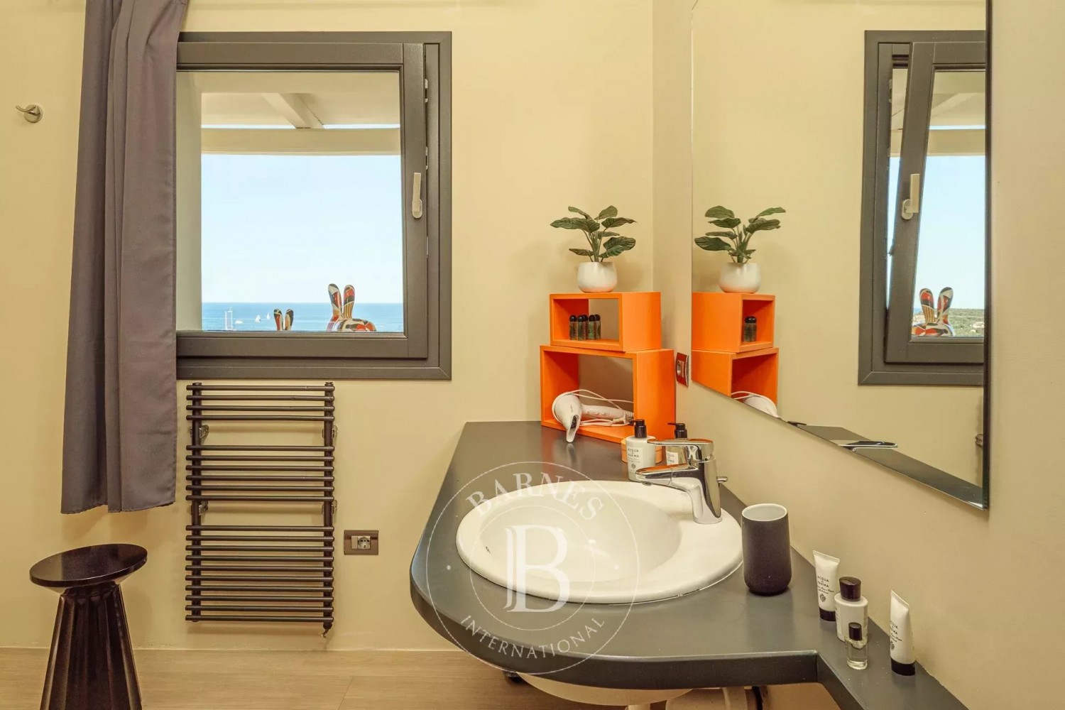 The villa features four beautifully appointed bedrooms, each with its own en-suite bathroom, providing the utmost in comfort and privacy for up to eight guests. An additional staff room with a double bed, private bathroom, and kitchenette offers added convenience for those traveling with personal staff or extra guests. The interiors are modern and filled with natural light, with a generous living area framed by expansive windows that open to magnificent sea views. A fully equipped, separate kitchen makes meal preparation effortless—whether for casual summer dining or elegant gatherings.