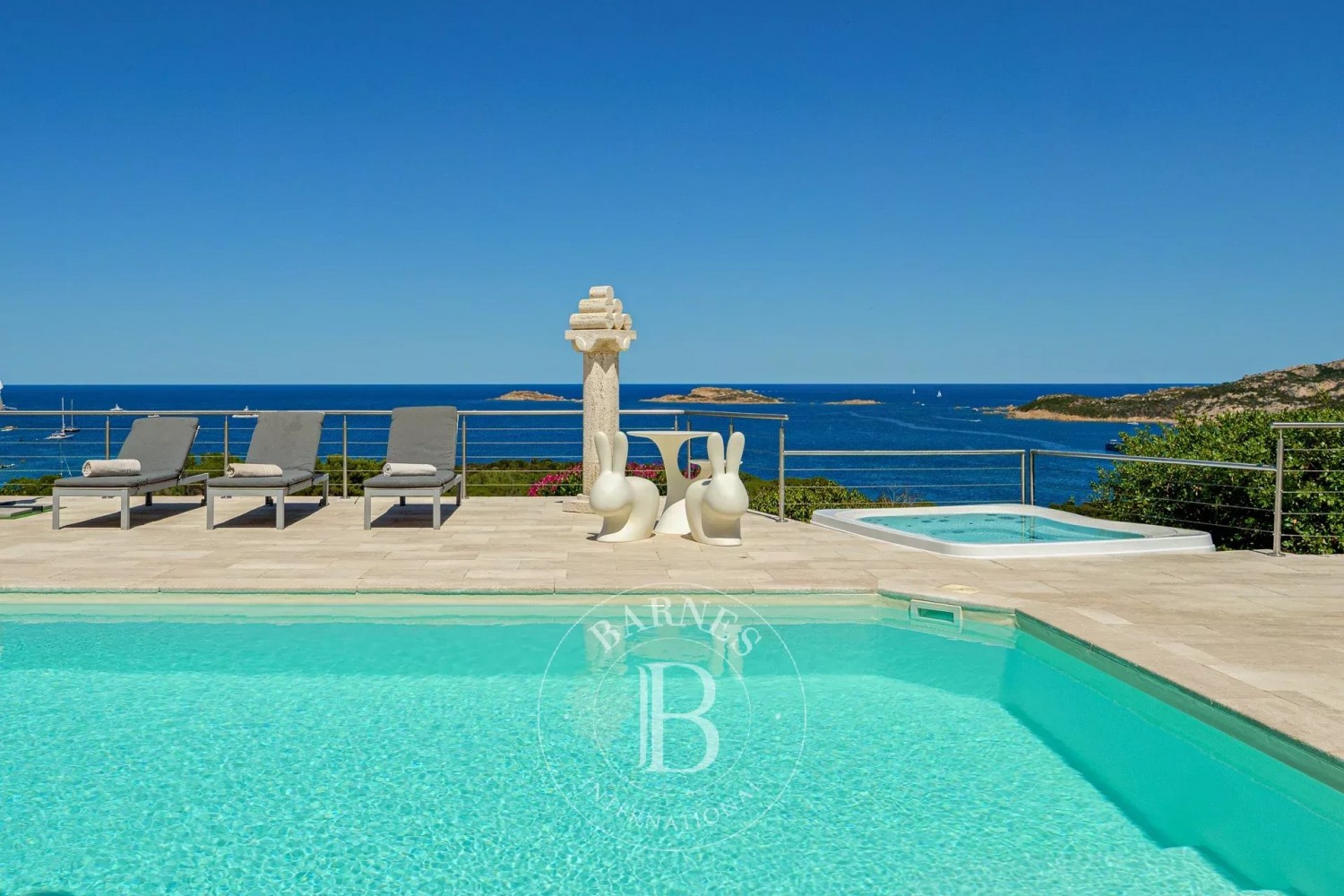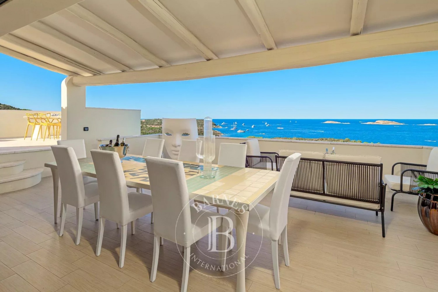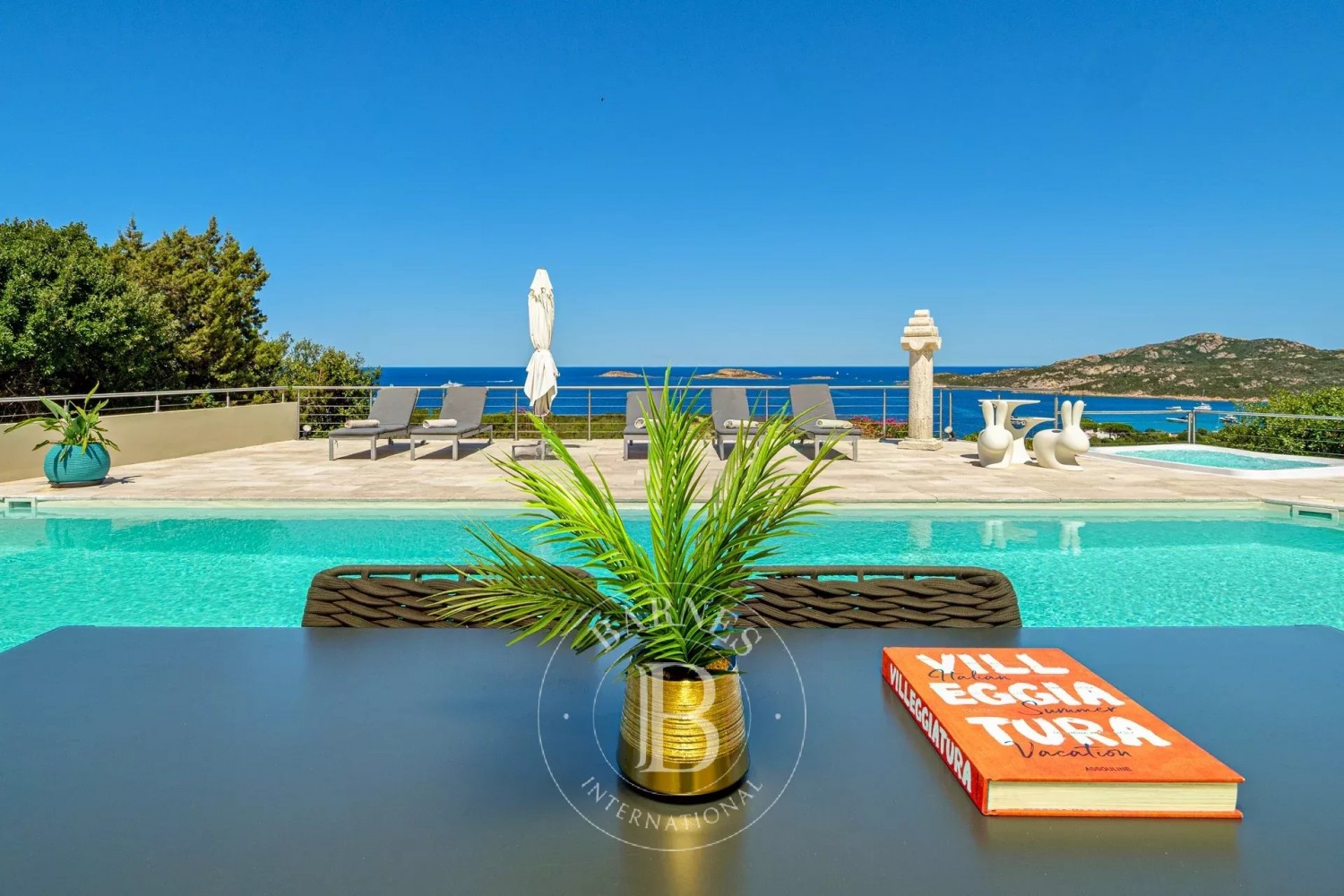 Every room is air-conditioned and equipped with high-speed Wi-Fi, ensuring maximum comfort and connectivity throughout your stay. Outdoors, the property offers a serene setting for both relaxation and entertaining. A meticulously landscaped Mediterranean garden opens onto panoramic terraces with sea views, a spectacular swimming pool complete with Jacuzzi, and a peaceful solarium area perfect for soaking up the Sardinian sun.