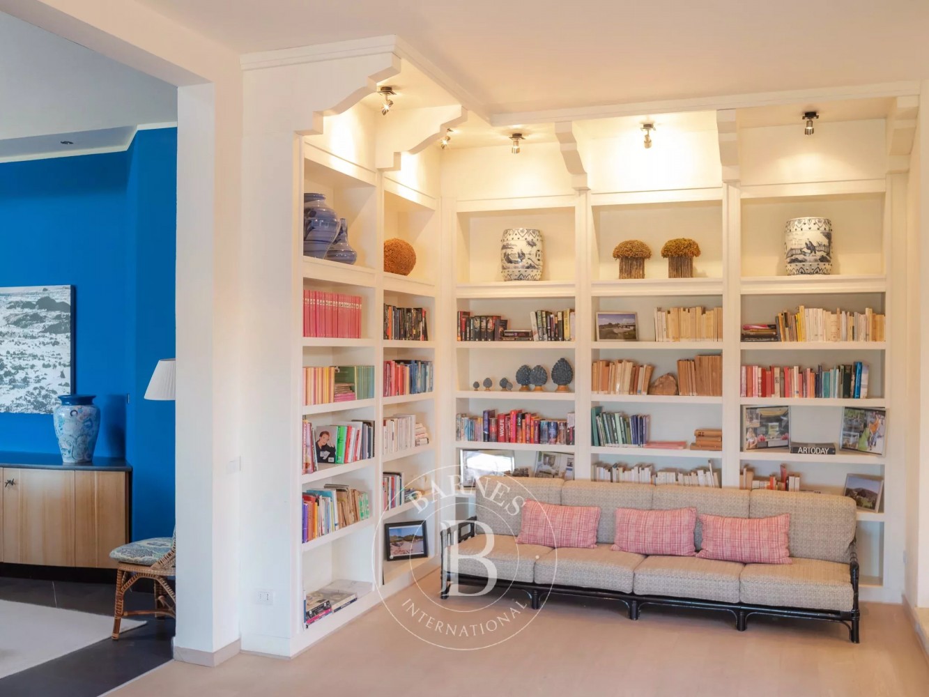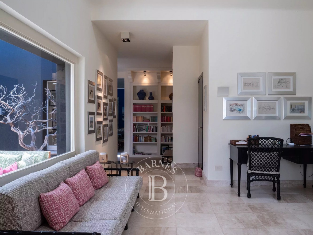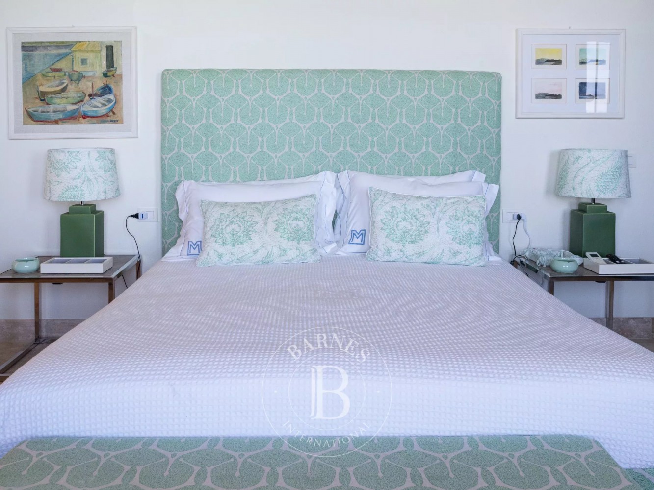 The villa, arranged on one level, has 7 double bedrooms and 7 bathrooms, plus two rooms dedicated to staff. The interiors are spacious and welcoming, with the dining room and living room overlooking a beautiful sea view. In addition, the house includes an office and a wellness area with a sauna, gym, and hammam.
