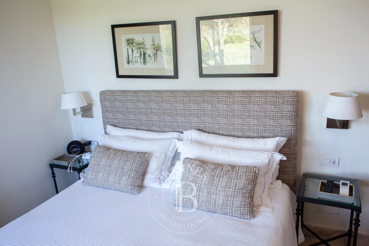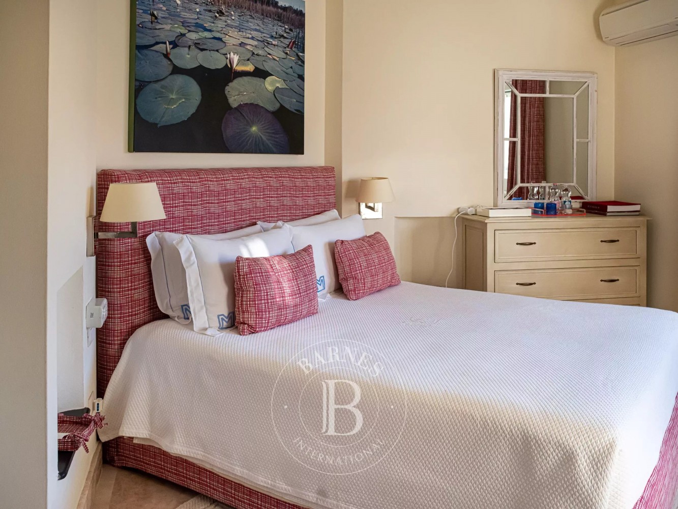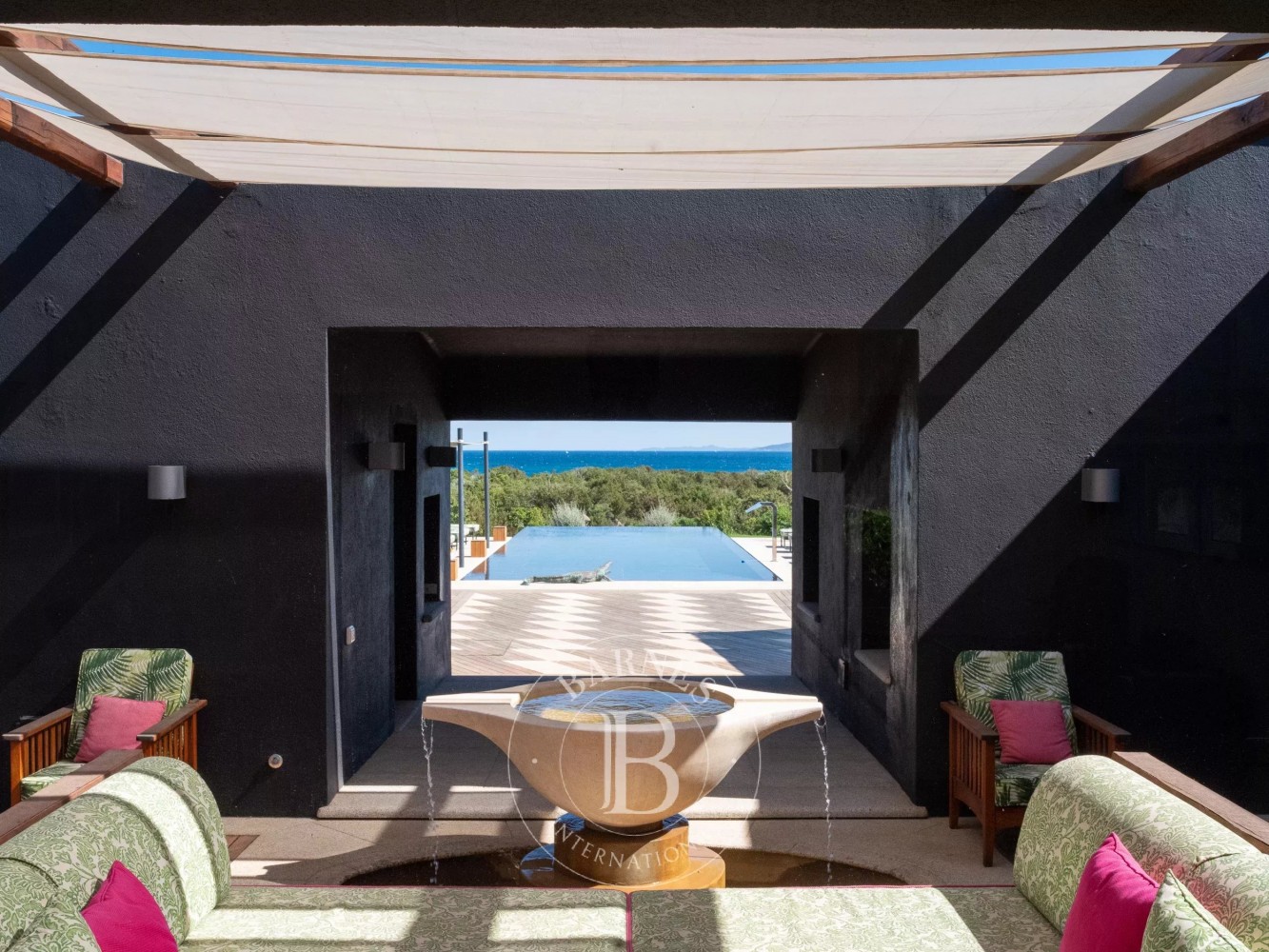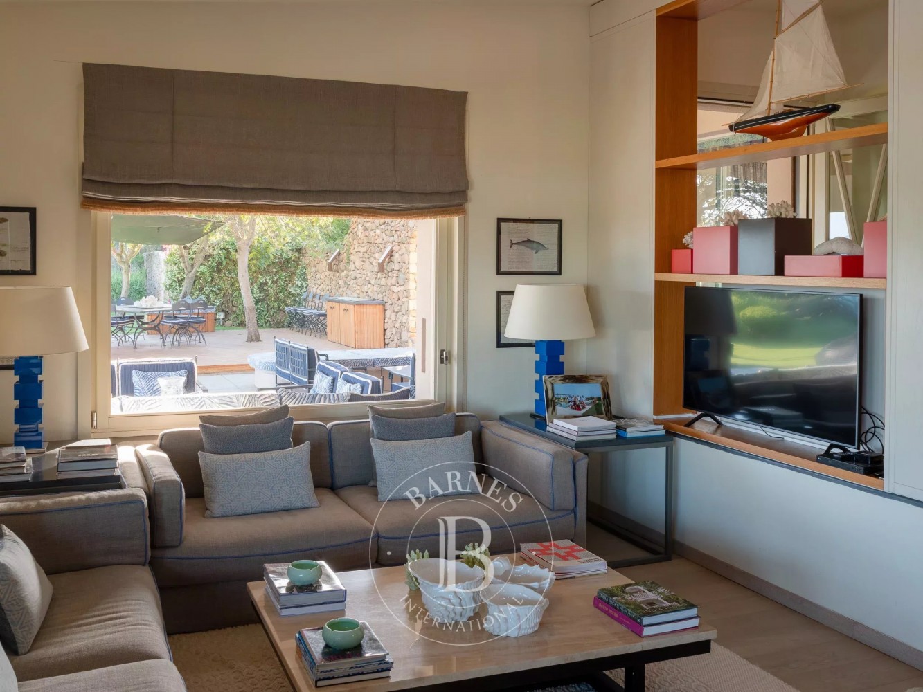 The villa, arranged on one level, has 7 double bedrooms and 7 bathrooms, plus two rooms dedicated to staff. The interiors are spacious and welcoming, with the dining room and living room overlooking a beautiful sea view. In addition, the house includes an office and a wellness area with a sauna, gym, and hammam.