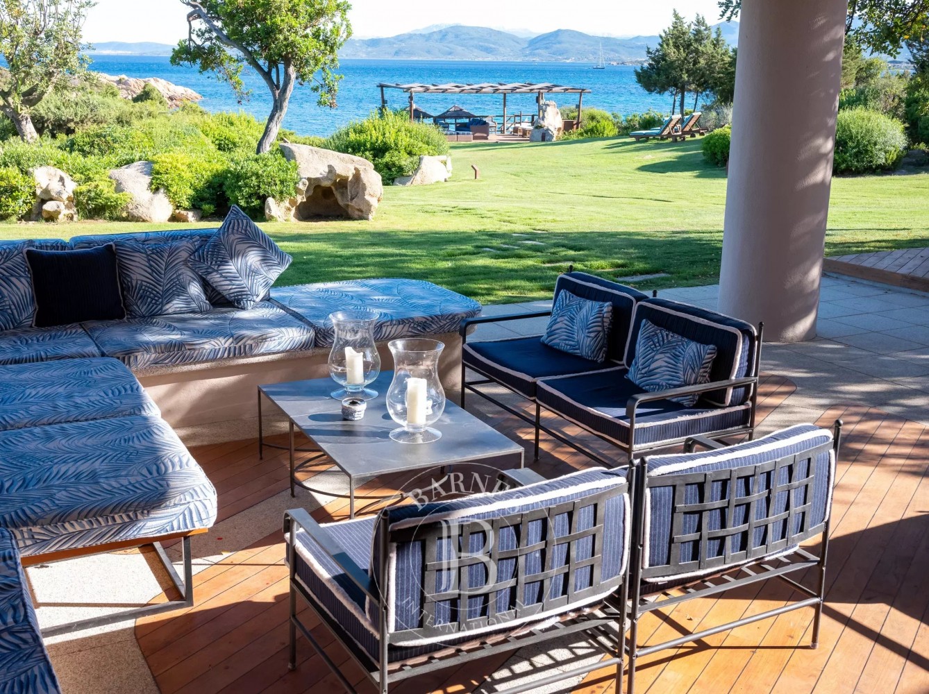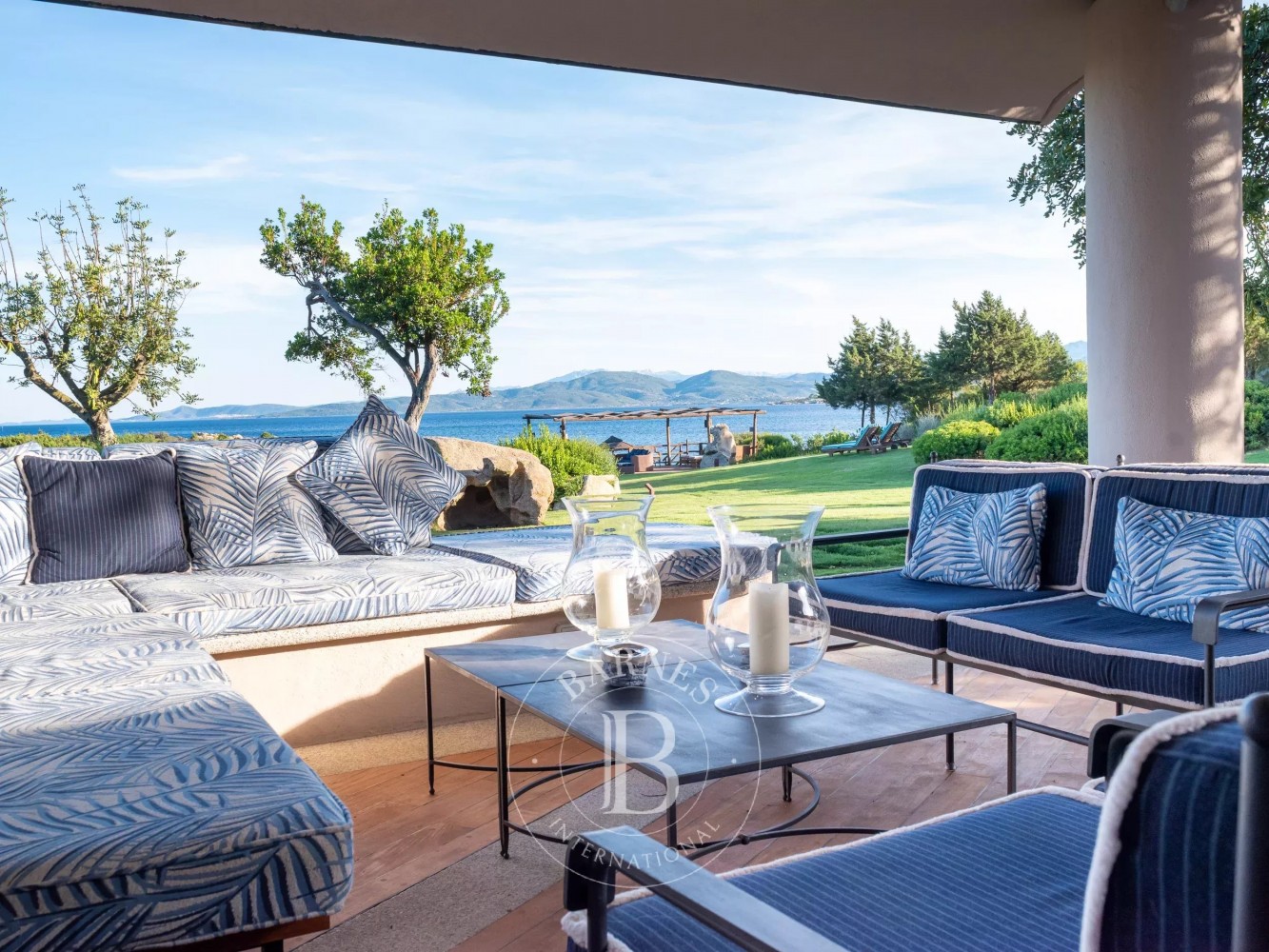 The vast garden surrounds the villa on all sides and features a well-manicured lawn, native plants, a swimming pool, and a wooden pergola, perfect for relaxing just a few steps from the beach. The large sea-facing sofas make aperitifs and after-dinner moments pleasant to spend in company.