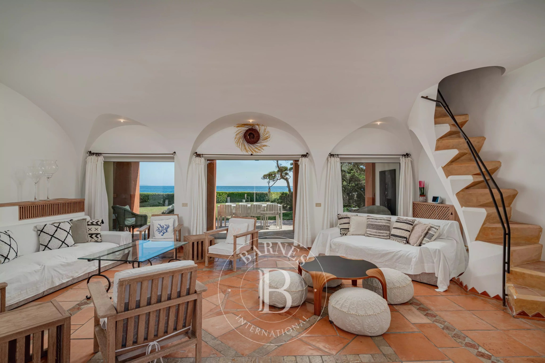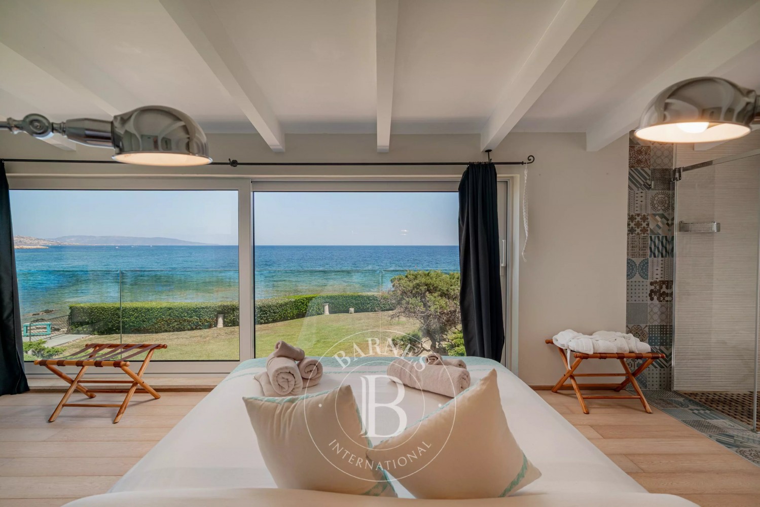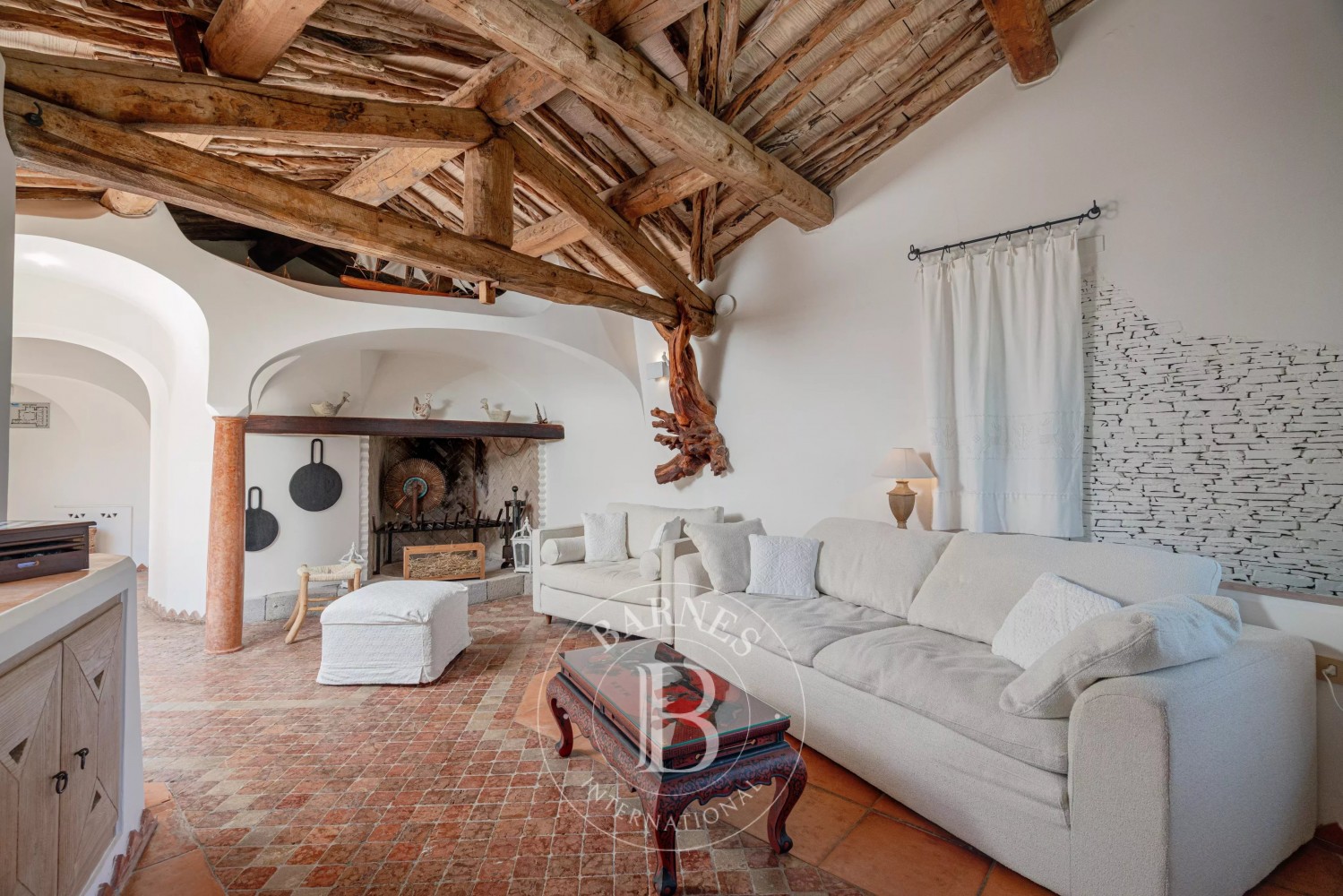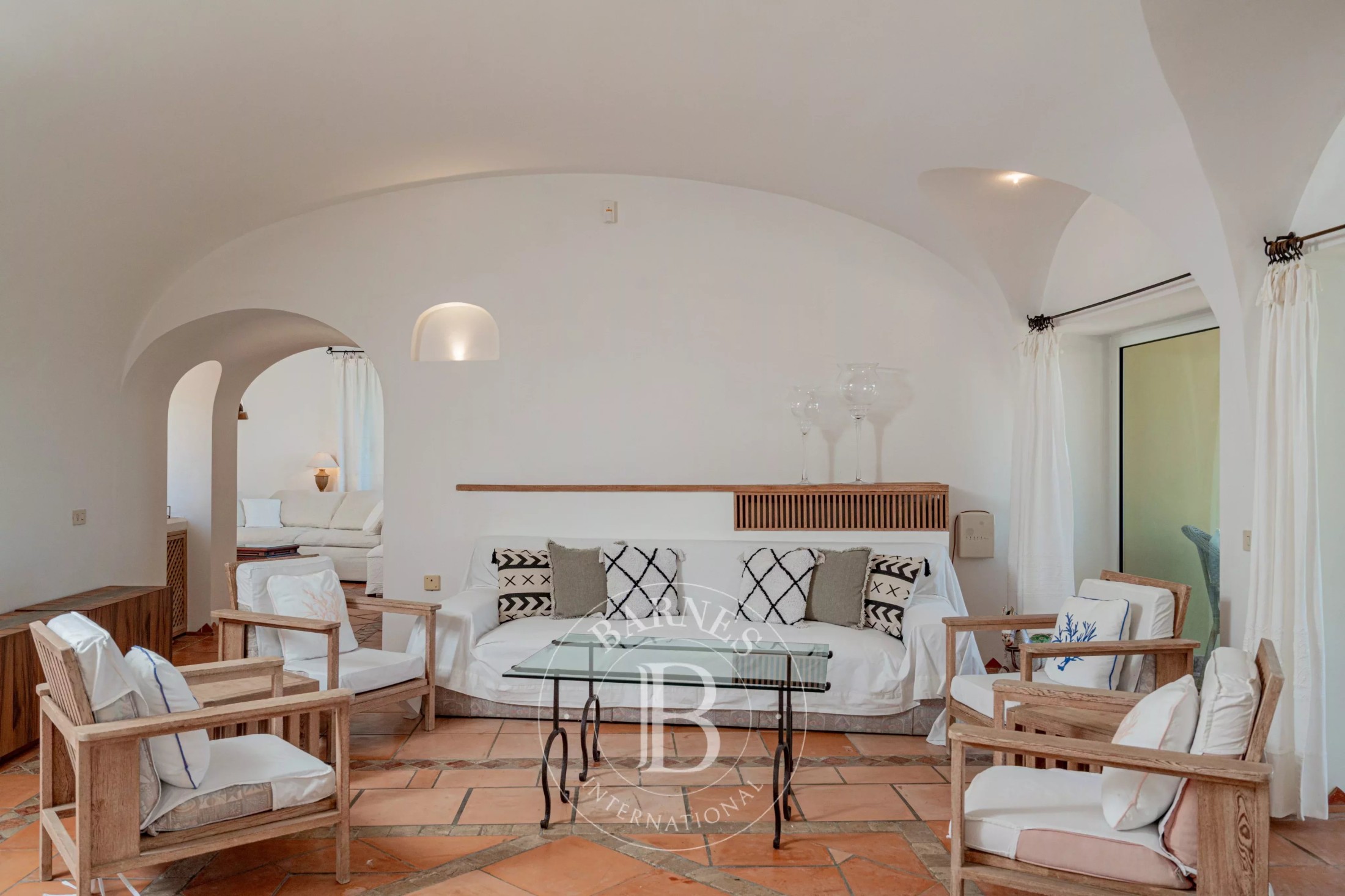 La résidence principale s’étend sur environ 500 m², offrant à ses hôtes des intérieurs spacieux et lumineux, organisés autour d’un grand espace de vie décloisonné encadré de larges baies vitrées panoramiques. La villa dispose d’un total de six chambres avec salle de bain privative, dont une spectaculaire suite parentale à l’étage supérieur, ouverte sur la piscine, le jardin et la mer. Une maison d’amis indépendante complète la propriété, tandis que les intérieurs reflètent un subtil équilibre entre héritage local et élégance contemporaine.