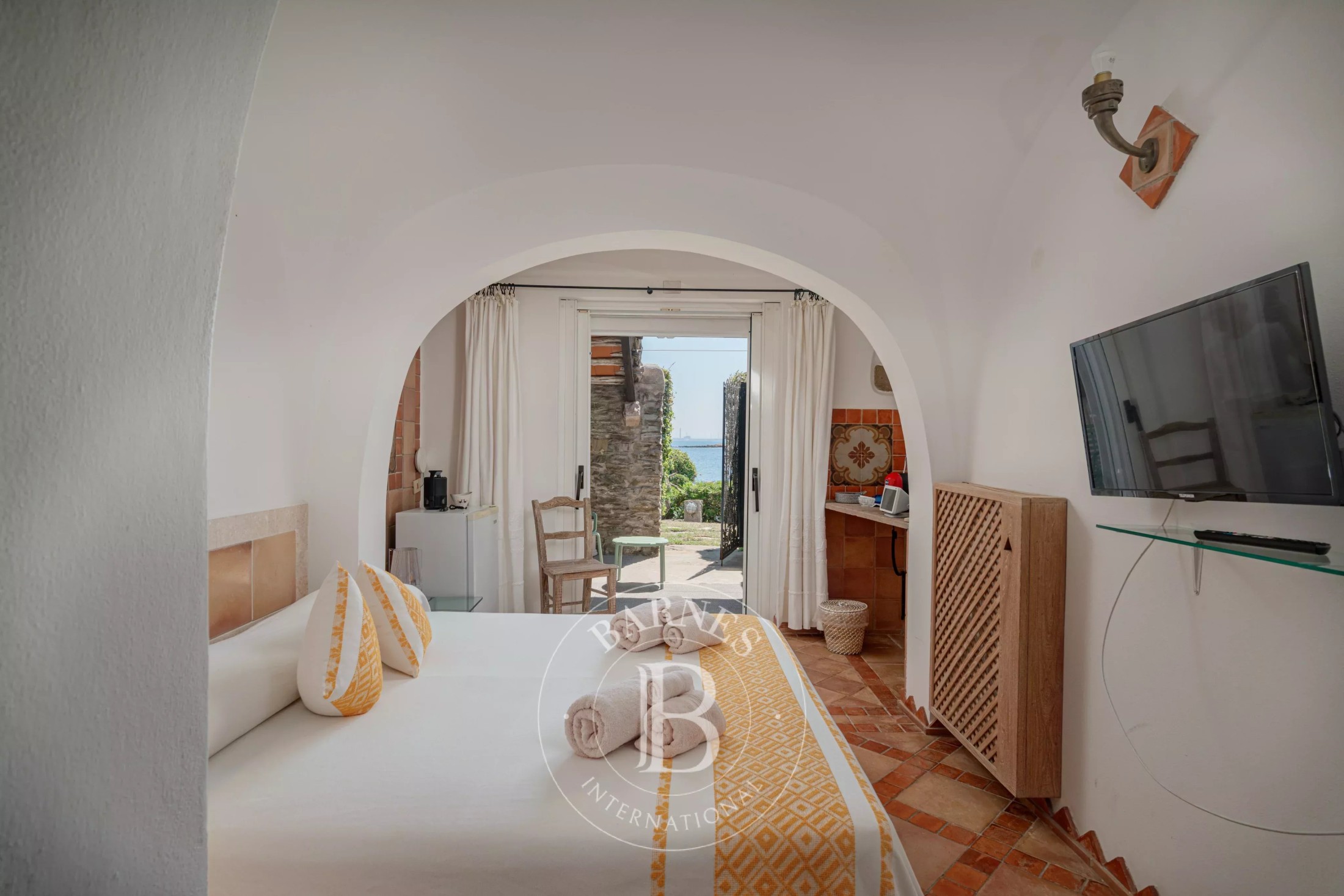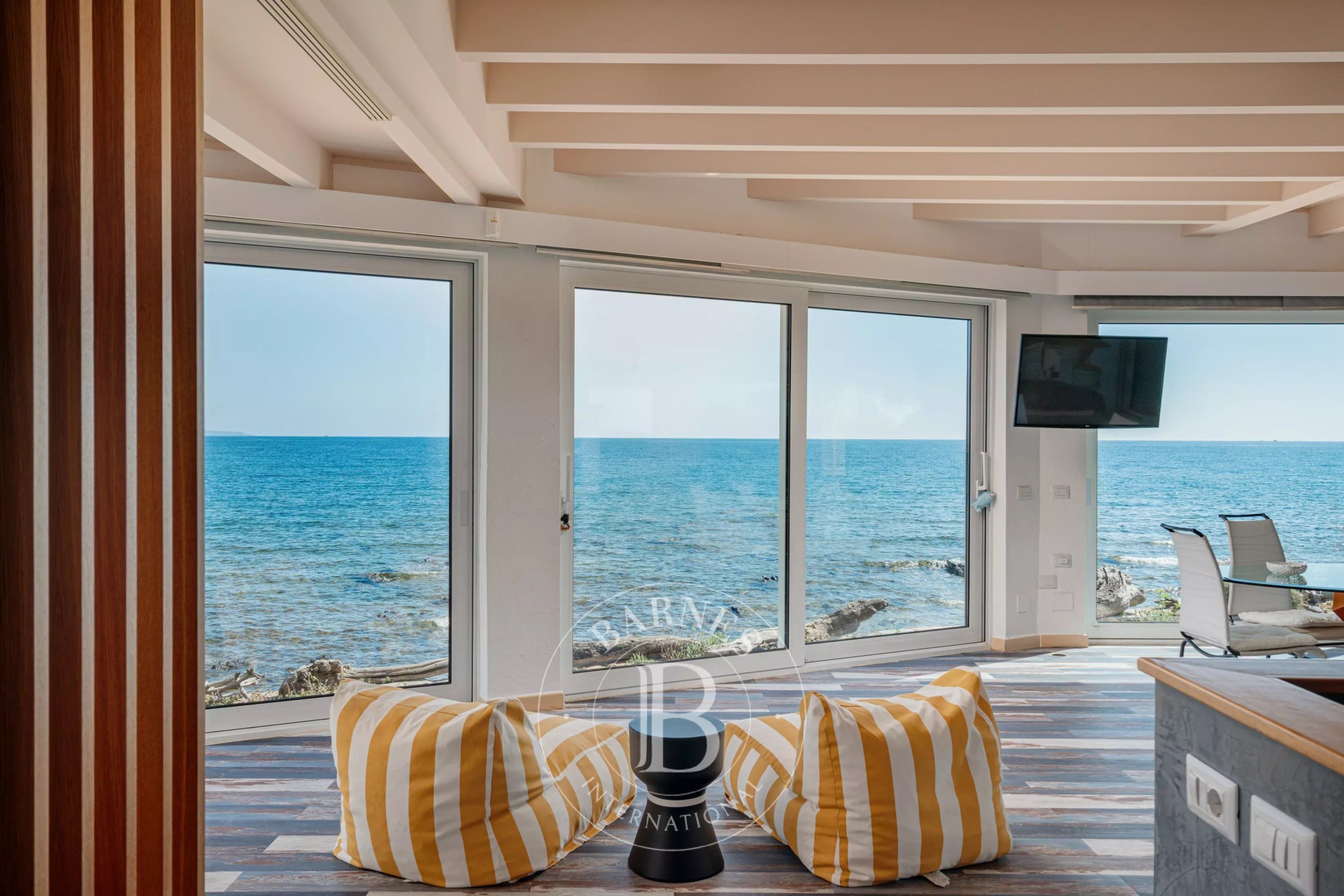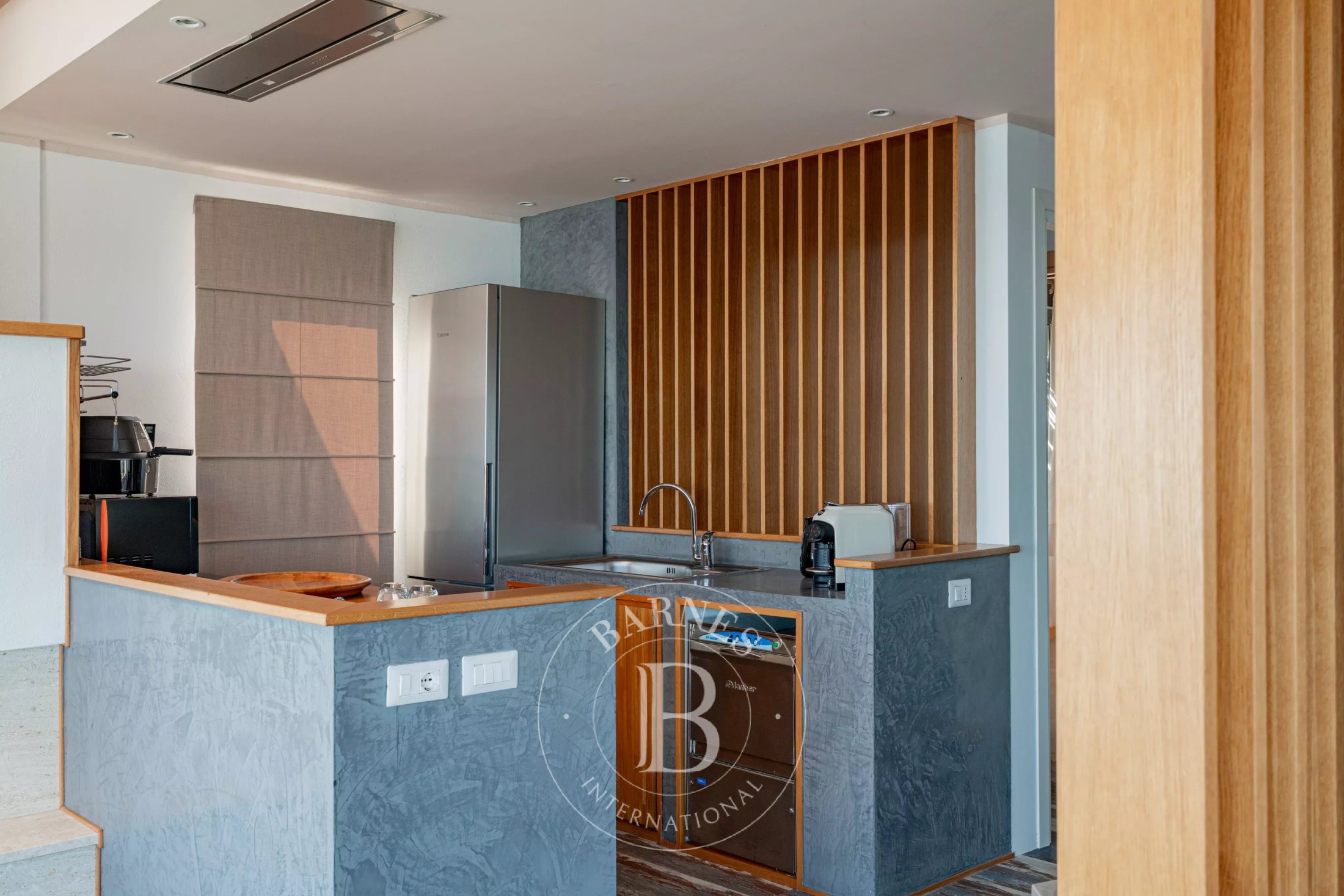 La résidence principale s’étend sur environ 500 m², offrant à ses hôtes des intérieurs spacieux et lumineux, organisés autour d’un grand espace de vie décloisonné encadré de larges baies vitrées panoramiques. La villa dispose d’un total de six chambres avec salle de bain privative, dont une spectaculaire suite parentale à l’étage supérieur, ouverte sur la piscine, le jardin et la mer. Une maison d’amis indépendante complète la propriété, tandis que les intérieurs reflètent un subtil équilibre entre héritage local et élégance contemporaine.