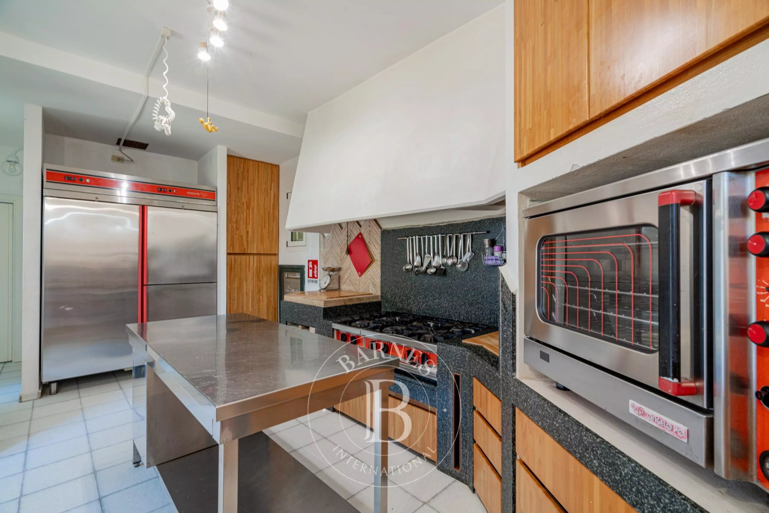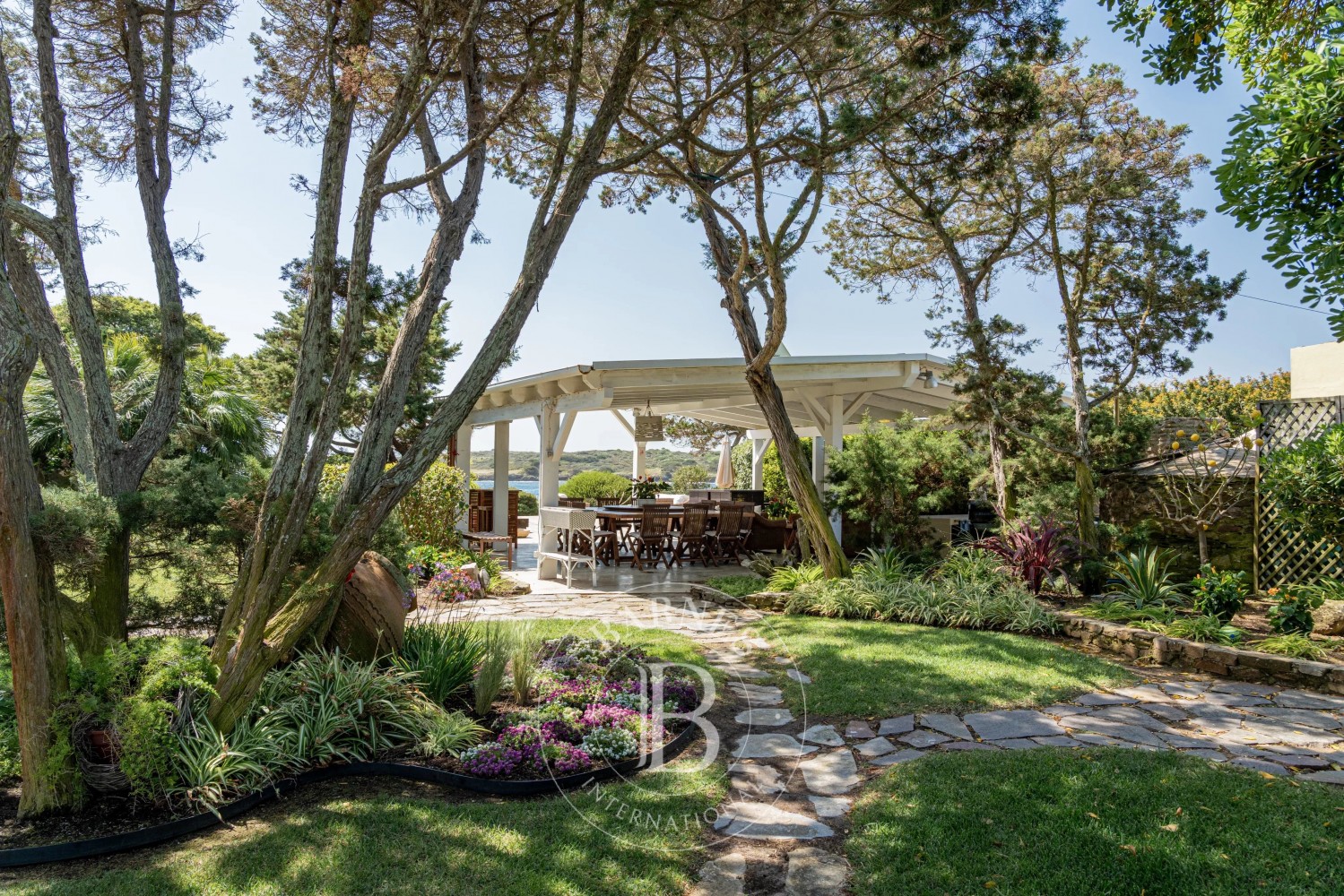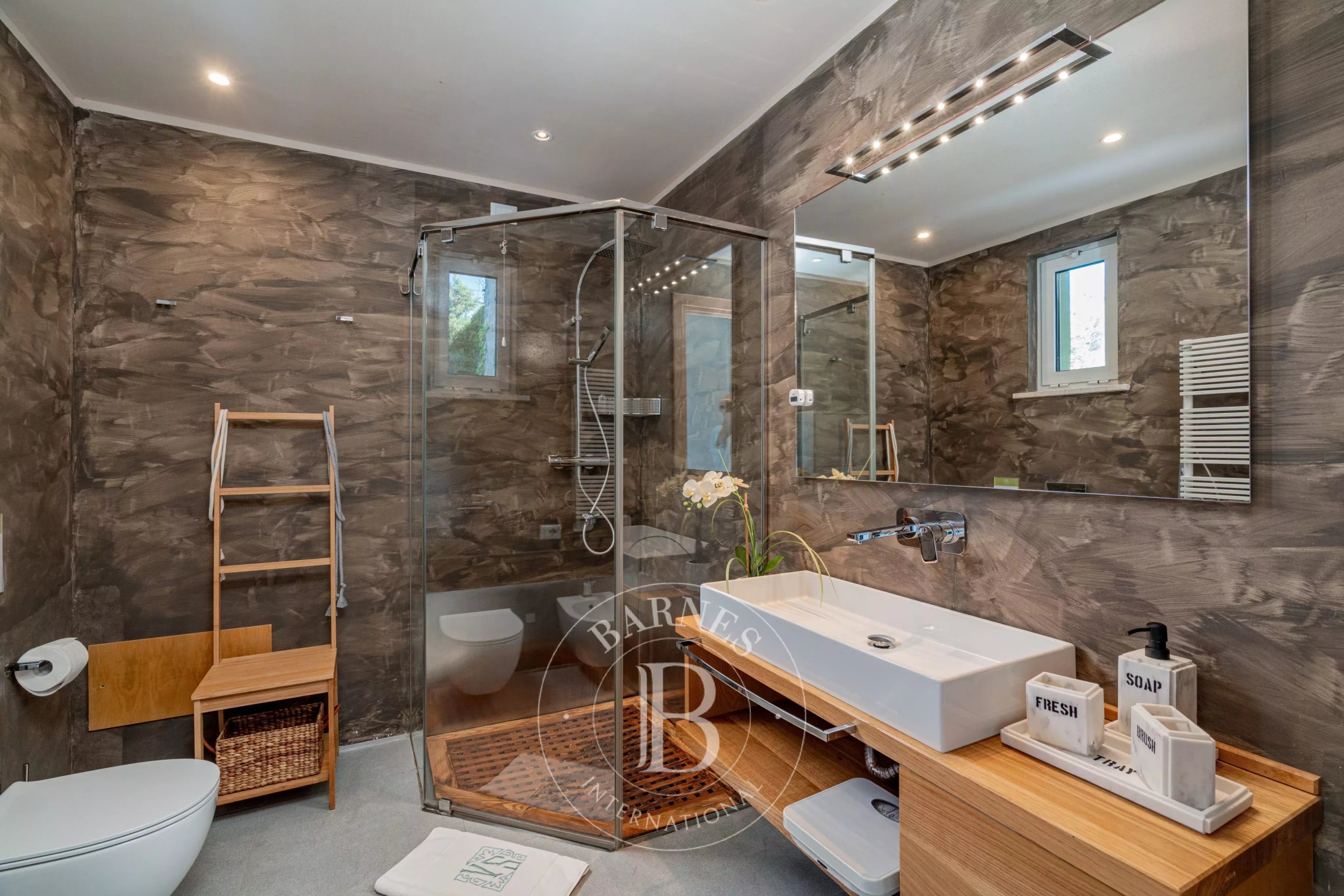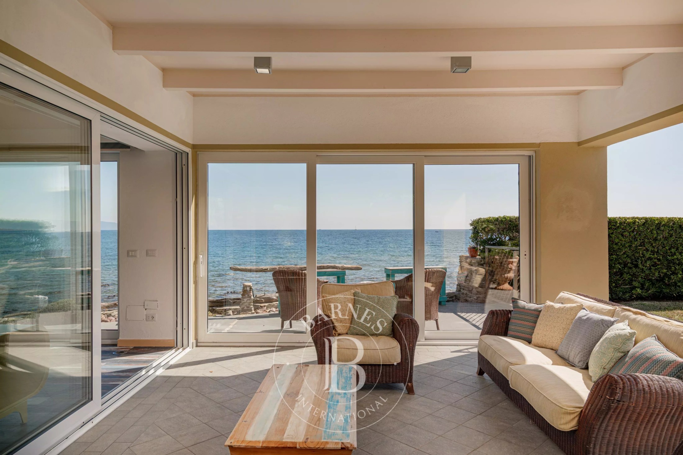 La résidence principale s’étend sur environ 500 m², offrant à ses hôtes des intérieurs spacieux et lumineux, organisés autour d’un grand espace de vie décloisonné encadré de larges baies vitrées panoramiques. La villa dispose d’un total de six chambres avec salle de bain privative, dont une spectaculaire suite parentale à l’étage supérieur, ouverte sur la piscine, le jardin et la mer. Une maison d’amis indépendante complète la propriété, tandis que les intérieurs reflètent un subtil équilibre entre héritage local et élégance contemporaine.